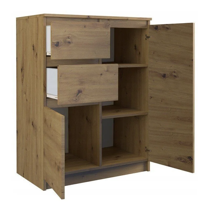 Levyn yläkerros peitetään usein erityisellä kalvolla, joka varmistaa huonekalun lujuuden. Viimeisimpien tuotantoteknologioiden avulla nämä laatat voivat olla kosteudenkestäviä, minkä vuoksi nämä materiaalit eroavat monipuolisuudestaan ja sopivat mihin tahansa huoneeseen. Lipasto NORE 2D2S 70, tammi väri löytää varmasti paikan kodistasi!