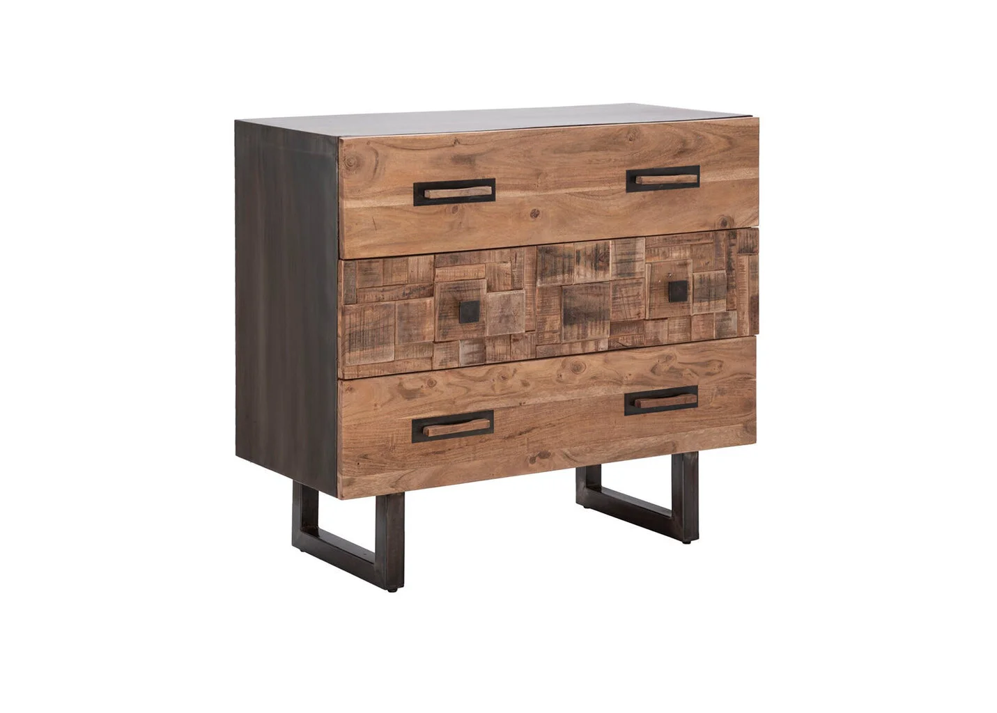 Moderni teollisuustyylinen lipasto on laadukasta akasiapuuta. Kaapissa on metalliset vetimet sekä jalat. Varustettu kolmella laatikolla, jotka liikkuvat ilman kiskoja.