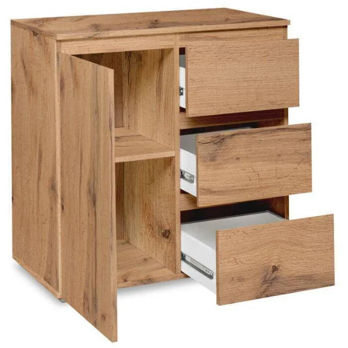 Levyn yläkerros peitetään usein erityisellä kalvolla, joka varmistaa huonekalun lujuuden. Viimeisimpien tuotantoteknologioiden avulla nämä laatat voivat olla kosteudenkestäviä, minkä vuoksi nämä materiaalit eroavat monipuolisuudestaan ja sopivat mihin tahansa huoneeseen. Image 2 2614 lipasto 1U3S, kultainen tammi löytää varmasti paikan kodistasi!
