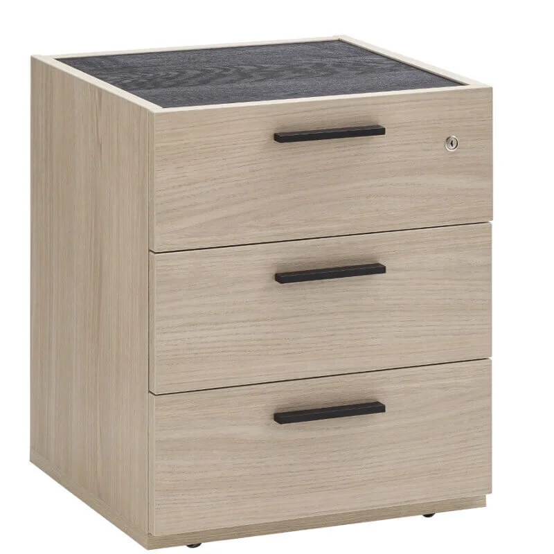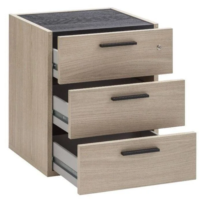 Se on valmistettu tammihuonekalulevyjäljitelmästä ja laatikkolaatikon yläosa on viimeistelty tummanharmaalla. Laatikon kahvat on valmistettu tummanharmaaksi maalatusta muovista