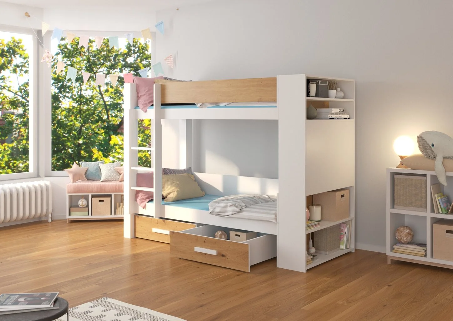 Moderni muotoilu: toimiva kerrossänky laatikoilla ja hyllyillä on täydellinen erilaisten tavaroiden säilyttämiseen. Se sopii ihanteellisesti minkä tahansa lastenhuoneen sisustukseen.