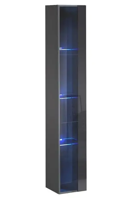 1 karkaistua lasia oleva ovi, jonka takana 3 lasihyllyä ja sininen LED-valaistus.