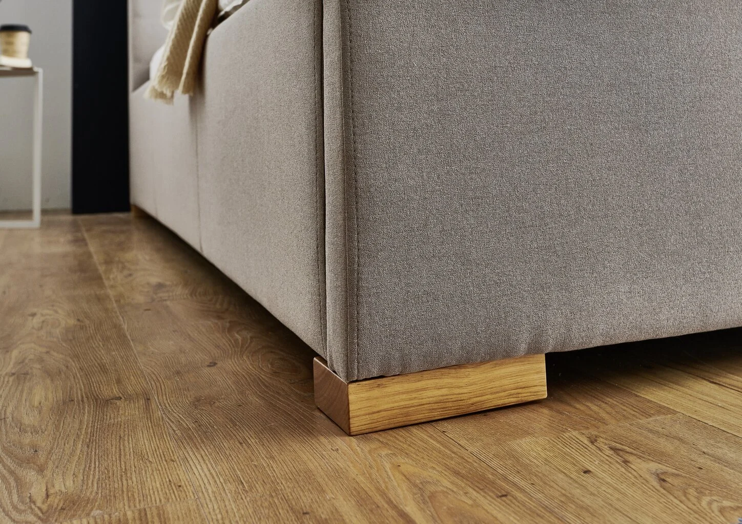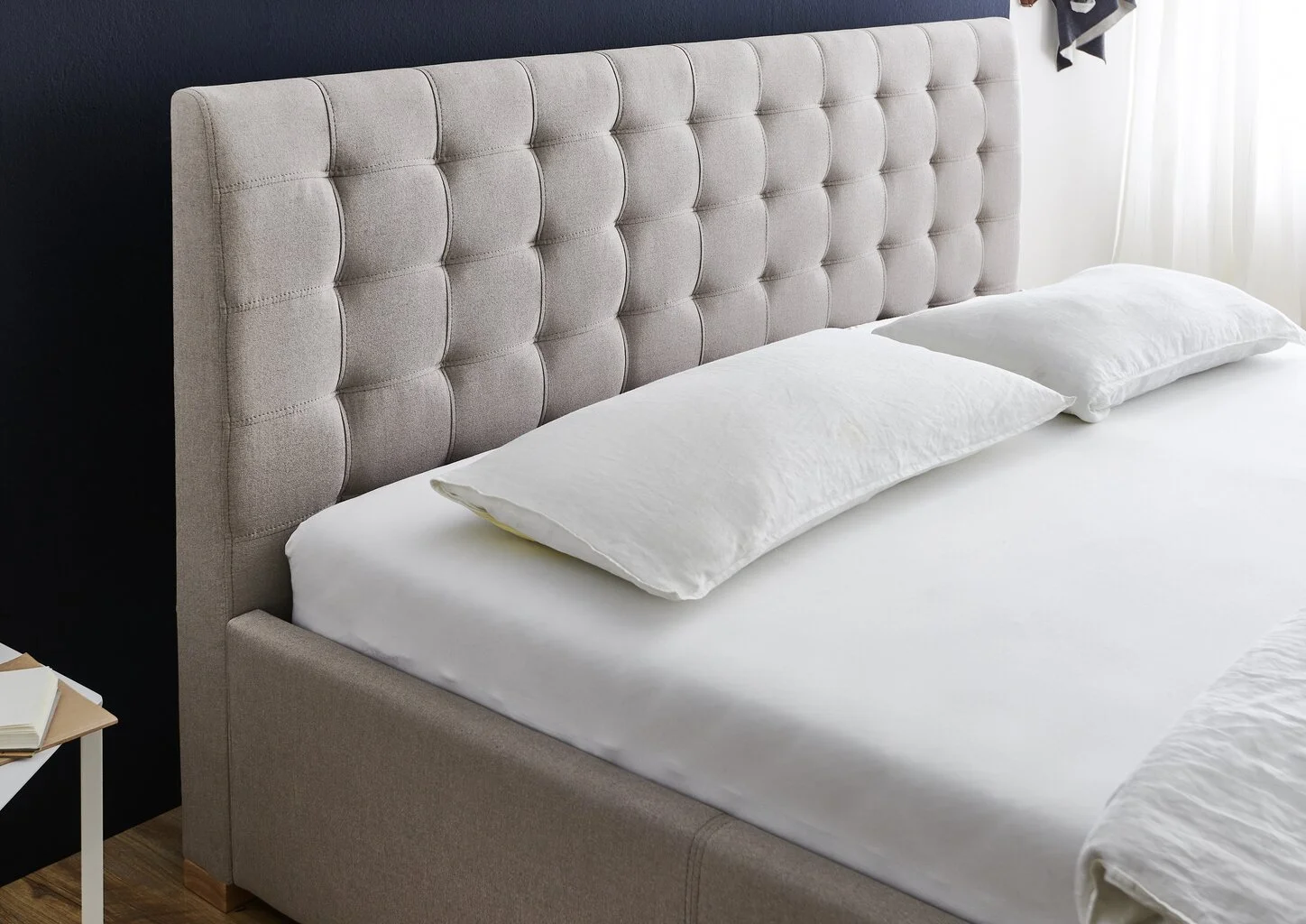Minimalistinen, skandinaavinen sänky, jossa on pehmeä ja mukava sängynpääty.