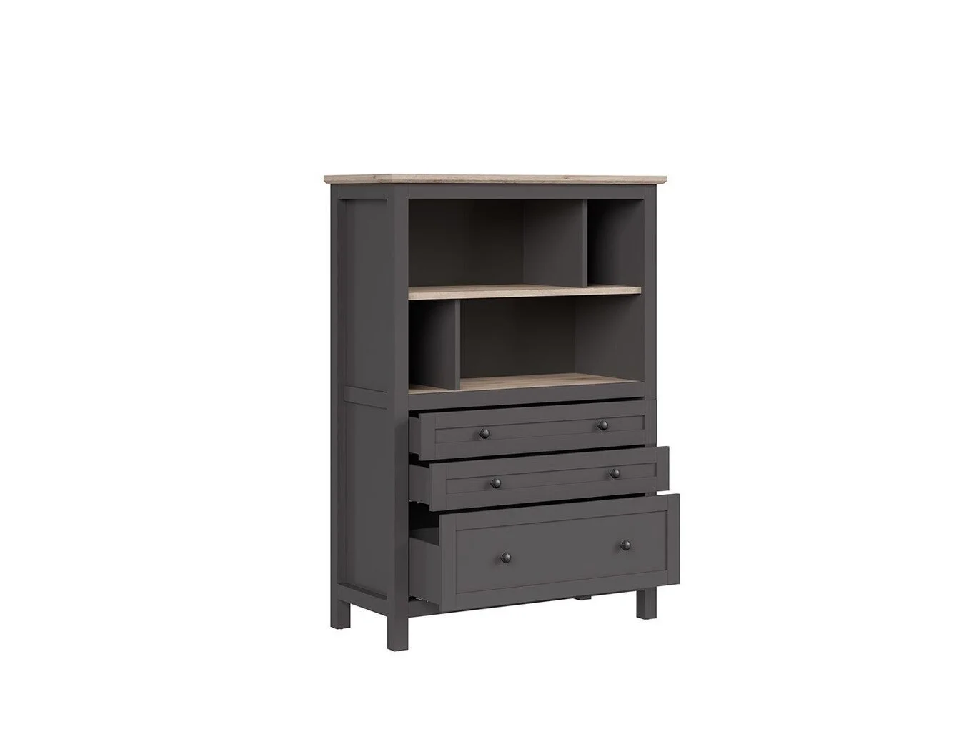 - Hylly, jossa on 3 laatikkoa ja 4 avointa osastoa;
