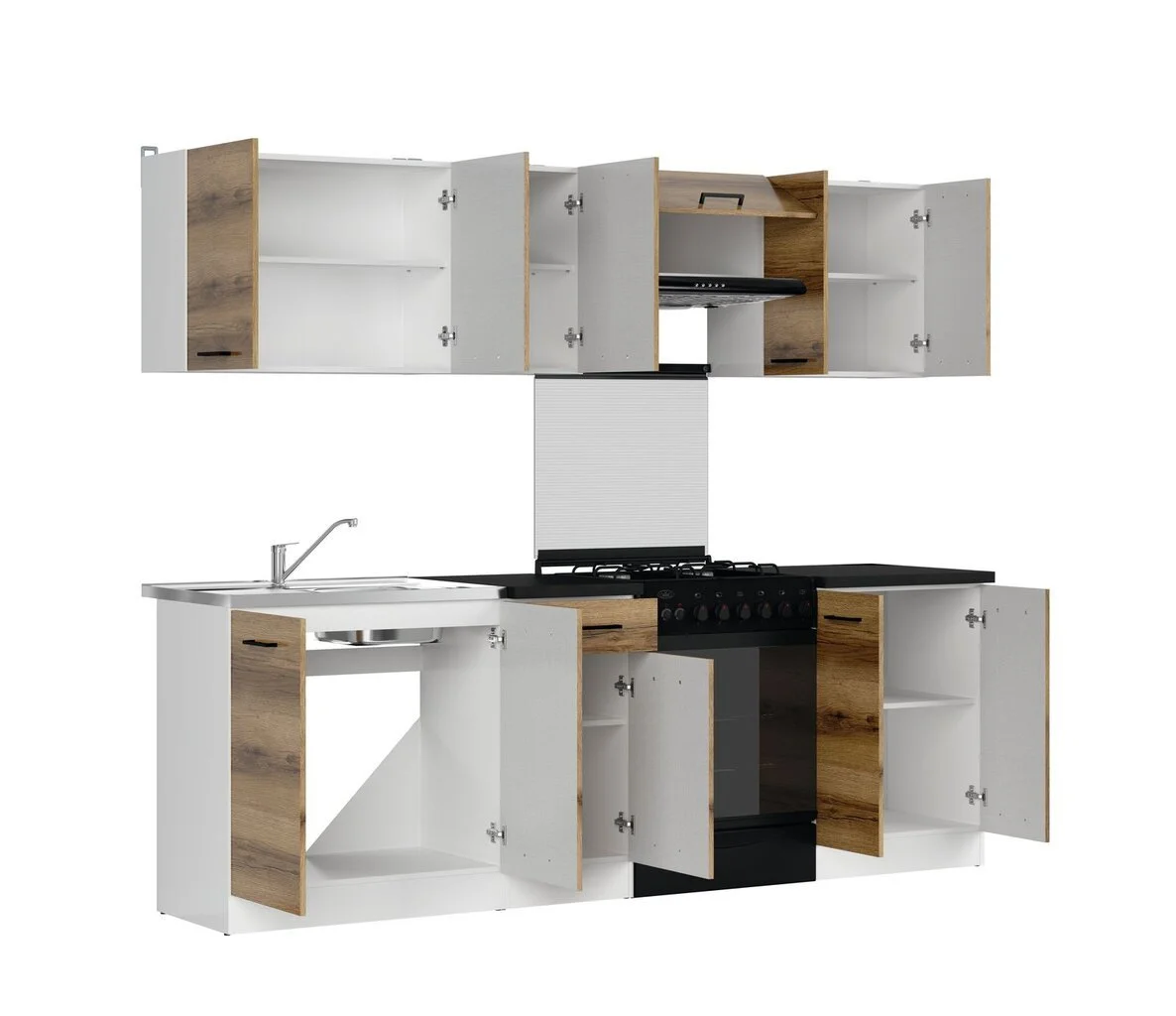 Levyn yläkerros peitetään usein erityisellä kalvolla, joka varmistaa huonekalun lujuuden. Viimeisimpien tuotantoteknologioiden avulla nämä laatat voivat olla kosteudenkestäviä, minkä vuoksi nämä materiaalit eroavat monipuolisuudestaan ja sopivat mihin tahansa huoneeseen. Keittiökaappisarja Junona Line 240, valkoinen/ruskea löytää varmasti paikan kodistasi!
