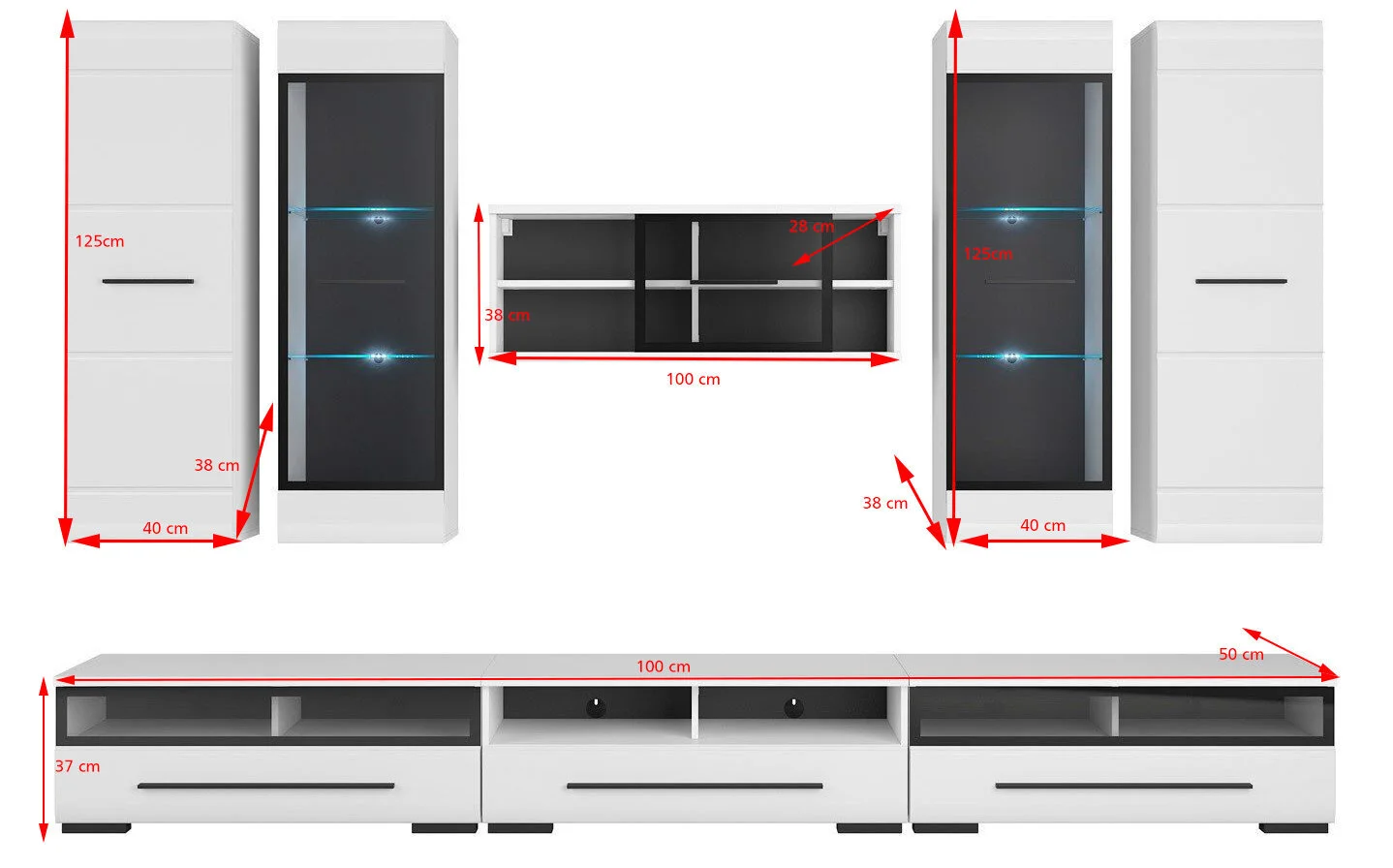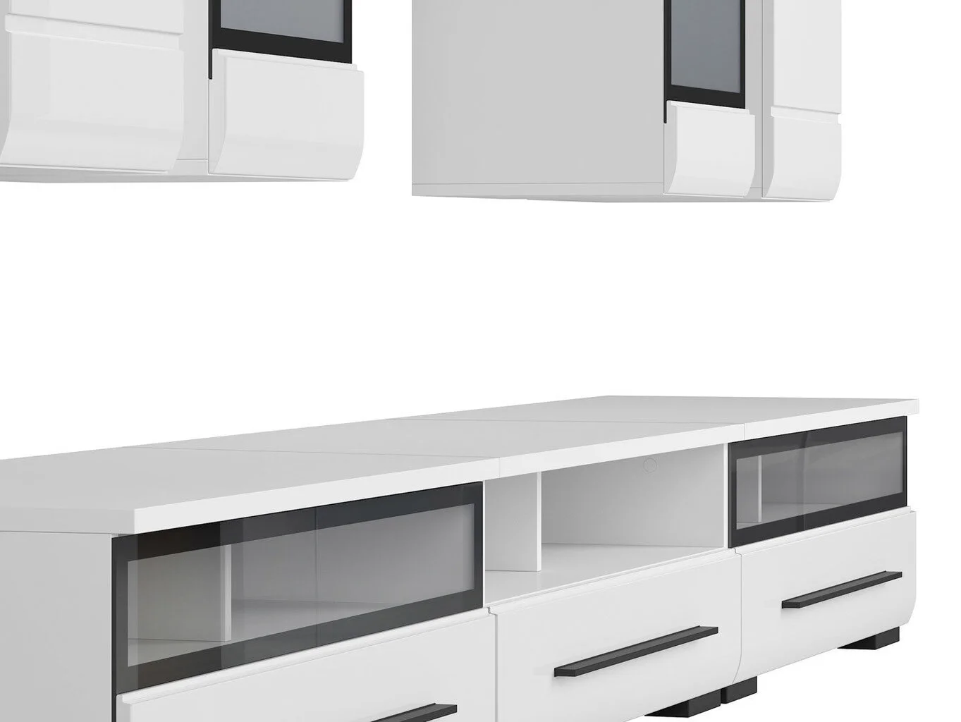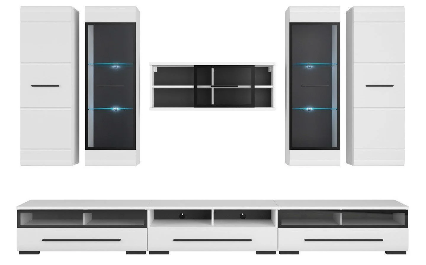 2 seinäkaappia, 2 seinävitriiniä, 1 seinähylly ja 3 TV-pöytää.