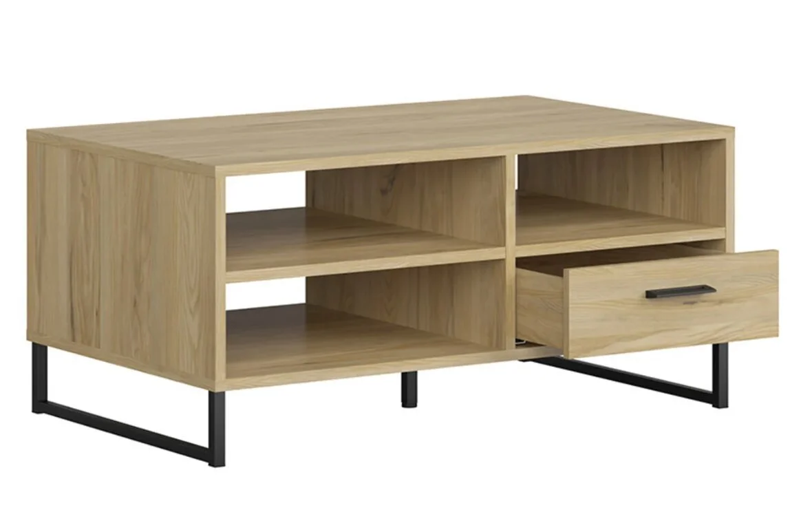 Sohvapöydässä on kolme avohyllyä ja yksi lukittava laatikko. Tyylikkäät metallikahvat.. Laatikon pehmeä ja hiljainen sulkeutuminen lisää huonekalujen käyttömukavuutta.
