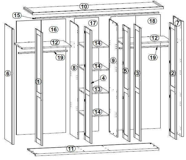 - Vaatekaapin sisällä – 2 suurta lokeroa, joissa on 2 poikkipalkkia vaatteiden ripustamista varten ja hylly poikkipalkin yläpuolella;