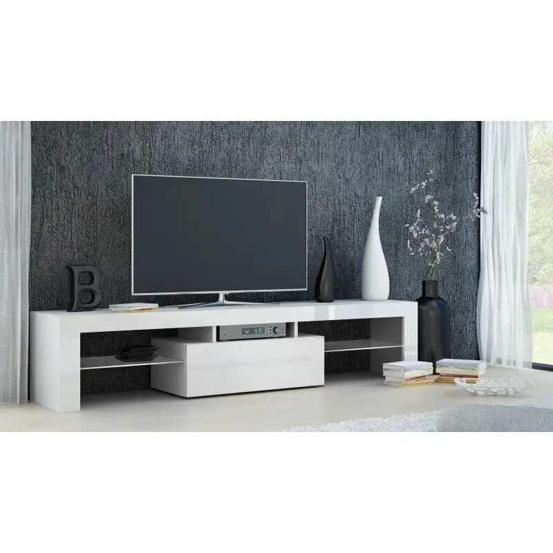 - Kaunis TV-taso on laadukasta ja kestävää laminoitua kuitulevyä ( MDF-levy ). Tason kaikki näkyvät reunat ovat nauhoitettu PVC-reunanauhalla.