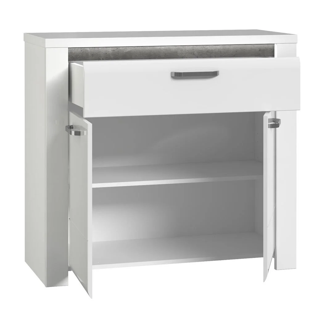 Kaikki nämä modernien huonekalujen ominaisuudet vahvistavat sen tosiasian, että tämän tyylin tuotteet ovat yksinkertaisia ja samalla erittäin yleisiä. Joten ne on helppo sijoittaa kaikenkokoisiin huoneisiin. Brugia-II-senkki, valkoinen-valkoinen korkeakiiltoinen-tummanharmaa pitää niistä, jotka haluavat luoda minimalistisen ja tilavan tilan, jossa on kunnollinen ja raikas luonto.