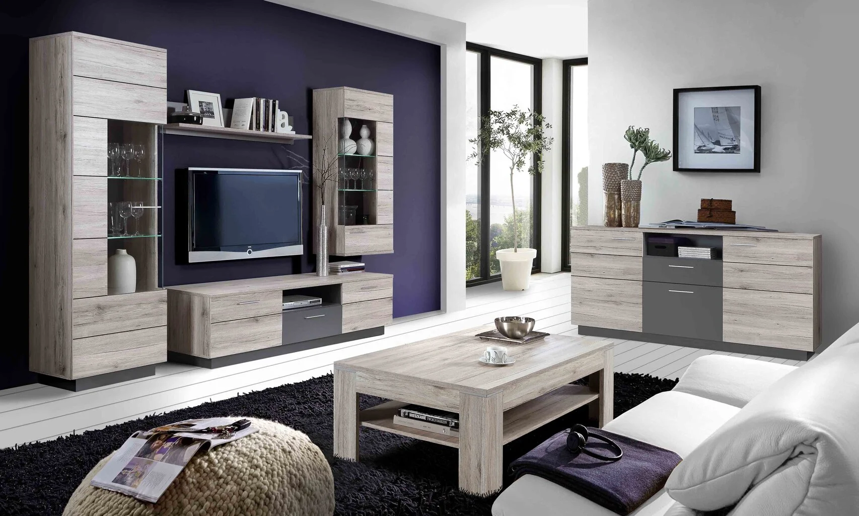Mitä yksinkertaisempi ja toimivampi huonekalu, sitä paremmin se sopii skandinaaviseen tyyliin. Jos haaveilet puhtaasta, tilavasta ja viihtyisästä ilmapiiristä, Jesolo -TV-kalustepaketti, hiekkatammi/harmaa on yksi parhaista valinnoista.