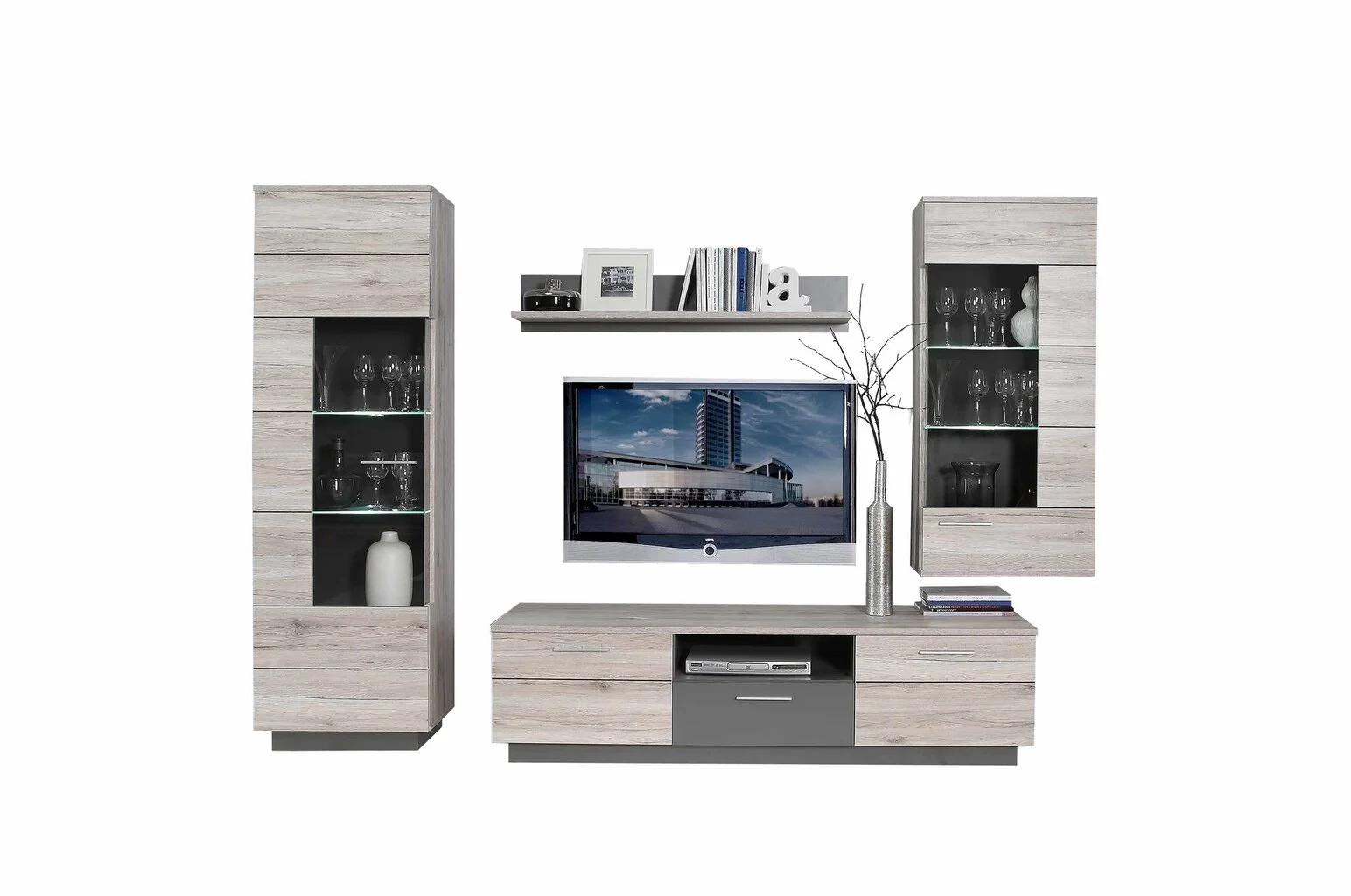 Levyn yläkerros peitetään usein erityisellä kalvolla, joka varmistaa huonekalun lujuuden. Viimeisimpien tuotantoteknologioiden avulla nämä laatat voivat olla kosteudenkestäviä, minkä vuoksi nämä materiaalit eroavat monipuolisuudestaan ja sopivat mihin tahansa huoneeseen. Jesolo -TV-kalustepaketti, hiekkatammi/harmaa löytää varmasti paikan kodistasi!