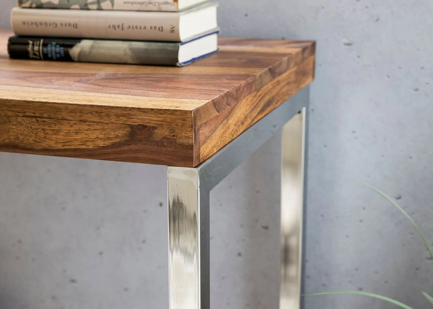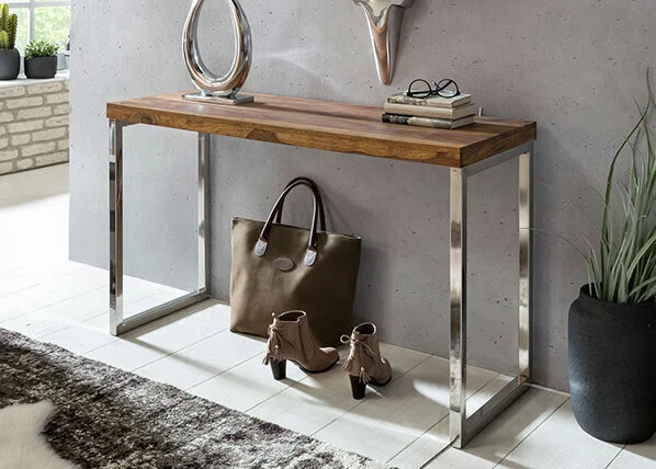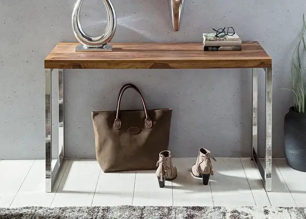 - Tyylikäs eteispöytä, jossa on metalliset kromatut jalat;