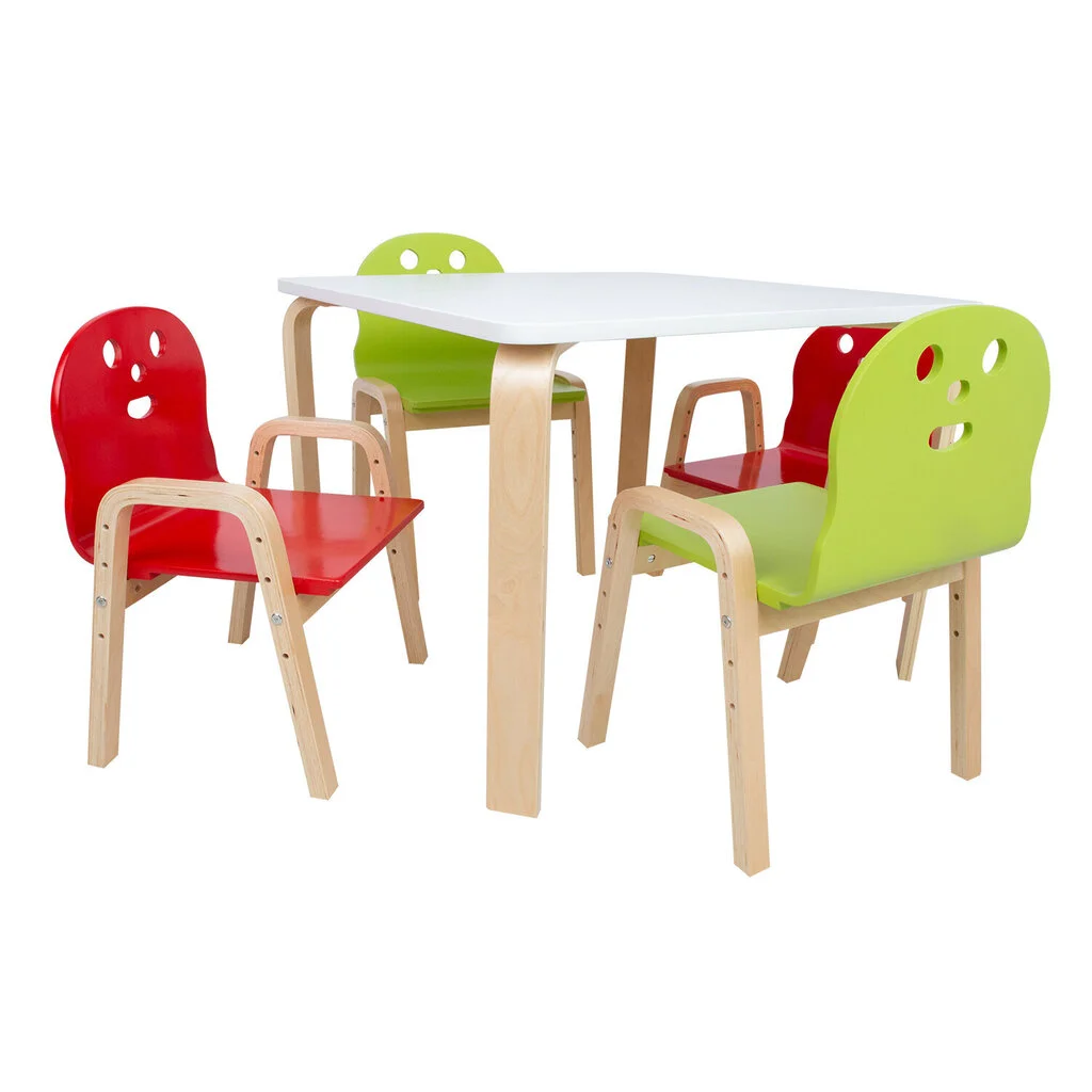 Lasten setti HAPPY pöytä ja 4 tuolia, valkoinen/punainen/vihreä. Pöydän mitat ovat 75x75xH50cm. Materiaali: poppelivaneri ja koivuviilu. Pöytälevy on maalattu valkoiseksi. Taivutetut vanerijalat on viimeistelty luonnonlakalla. Chair HAPPY kasvaa lapsesi mukana! Istuimen korkeutta voidaan nostaa neljä kertaa lapsen pituuden mukaan – 21/25,5/30/34,5 cm. Tuolin kokonaismitat ovat 39x36xK46,5/51/55,5/60cm. Istuimen leveys 33cm, istuimen syvyys 31cm, selkänojan korkeus 27cm, käsinojan korkeus maasta 36cm. Materiaali: taivutettu poppelivaneri, jossa koivuviilu. Istuimet on maalattu punaiseksi ja vihreäksi, jalat ja runko on viimeistelty luonnonlakalla. Painorajoitus 40 kg.