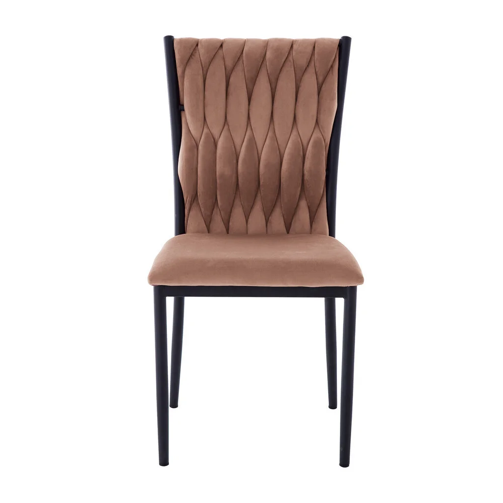 Tuoli EMORY samettia. Tuolin istuin ja selkänoja on verhoiltu samettikankaalla. Selkänojan tilava aaltomainen pehmuste on saavutettu kudontatekniikalla. Kannen materiaali: 100 % polyesteriä, 260 g/m². Martindale: Tuolin jalat ja runko on valmistettu metallista ja viimeistelty mustalla jauhemaalauksella. Tuolin kokonaismitat ovat 47x59xH93cm, istuimen leveys 46cm, istuinsyvyys 42cm, istuinkorkeus 48cm. Selkänojan korkeus 51 cm. Painoraja 120kg.