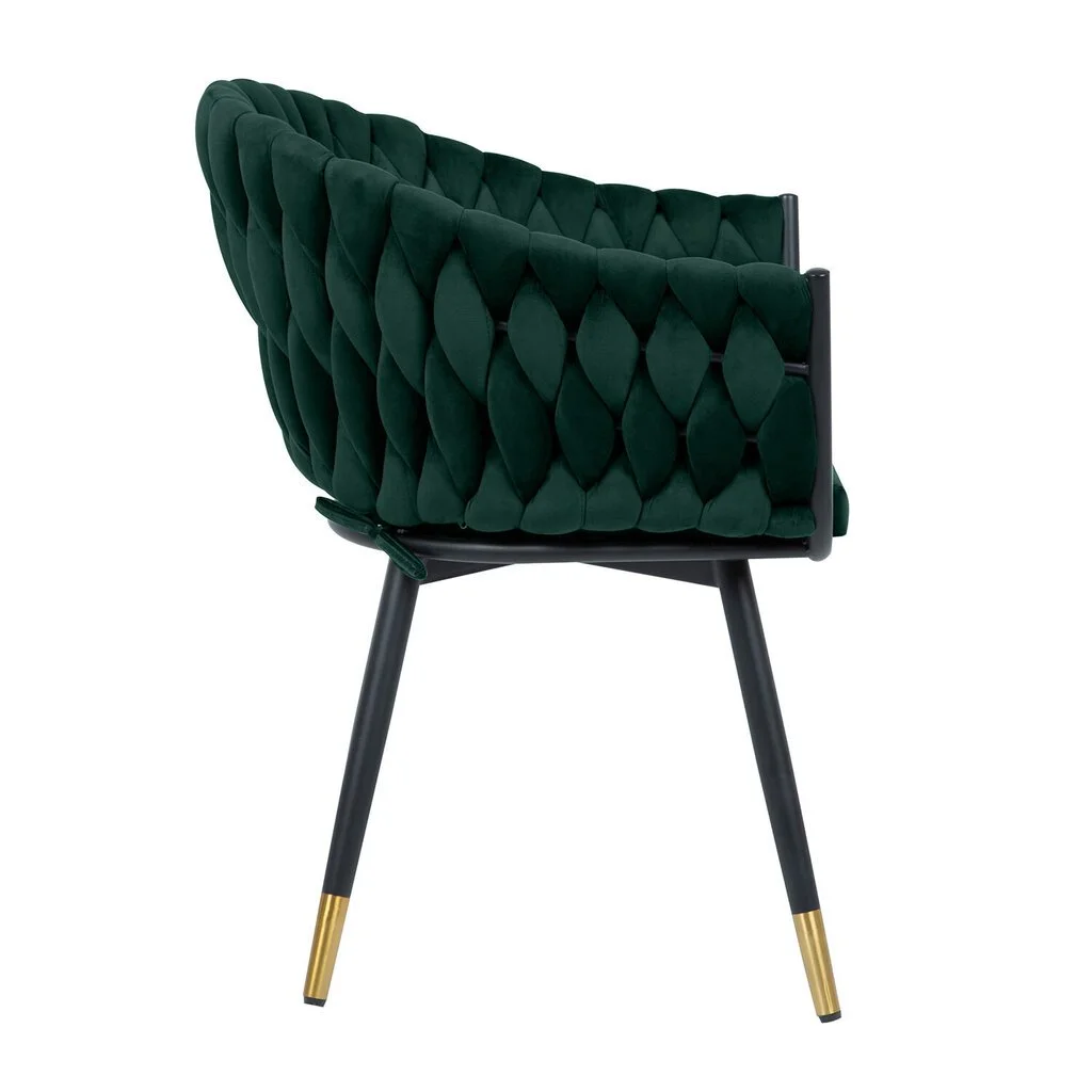 Tuoli FLORA tummanvihreä sametti. Tuolin istuin ja selkänoja on verhoiltu ja päällystetty samettikankaalla. Selkänojan tuuhea aaltomainen pehmuste on saatu aikaan kudontatekniikalla. Pieni lisätyyny tuolin selkänojassa takaa paremman istumismukavuuden. Tyynyn mitat 38x28cm. Kannen materiaali: 100 % polyesteriä, 260 g/m². Martindale 25 000. Tuolin jalat ja runko on valmistettu metallista ja viimeistelty mustalla jauhemaalilla, jalkojen alapäät ovat kultaiset. Tuolin kokonaismitat ovat 61x63xH83cm, istuimen leveys 45cm, istuimen syvyys 46cm ja istuimen korkeus 50cm. Selkänojan korkeus 38cm. Painoraja 120kg.