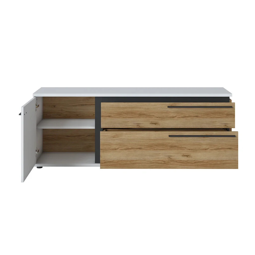 TV-taso SALINAS 153x40xH58cm. Salinas-sarja tekee vaikutuksen väriyhdistelmällä, joka on yhtä aikaa muodikas ja ajaton. Universaalisuutensa ansiosta TV-pöytä sopii täydellisesti mihin tahansa sisustukseen. Se tarjoaa myös runsaasti säilytystilaa. Pehmeästi sulkeutuvan etuosan taakse on piilotettu kaksi tilavaa laatikkoa ja hylly. TV-pöytä on valmistettu laadukkaista, kestävistä materiaaleista. Runko on valmistettu laminoidusta lastulevystä, joka kestää hyvin naarmuuntumista ja värimuutoksia. Vetimet ja jalat ovat muovia. Tuotteen mitat ovat 153x40xH58cm. Tuote on valmistettu EU:ssa.