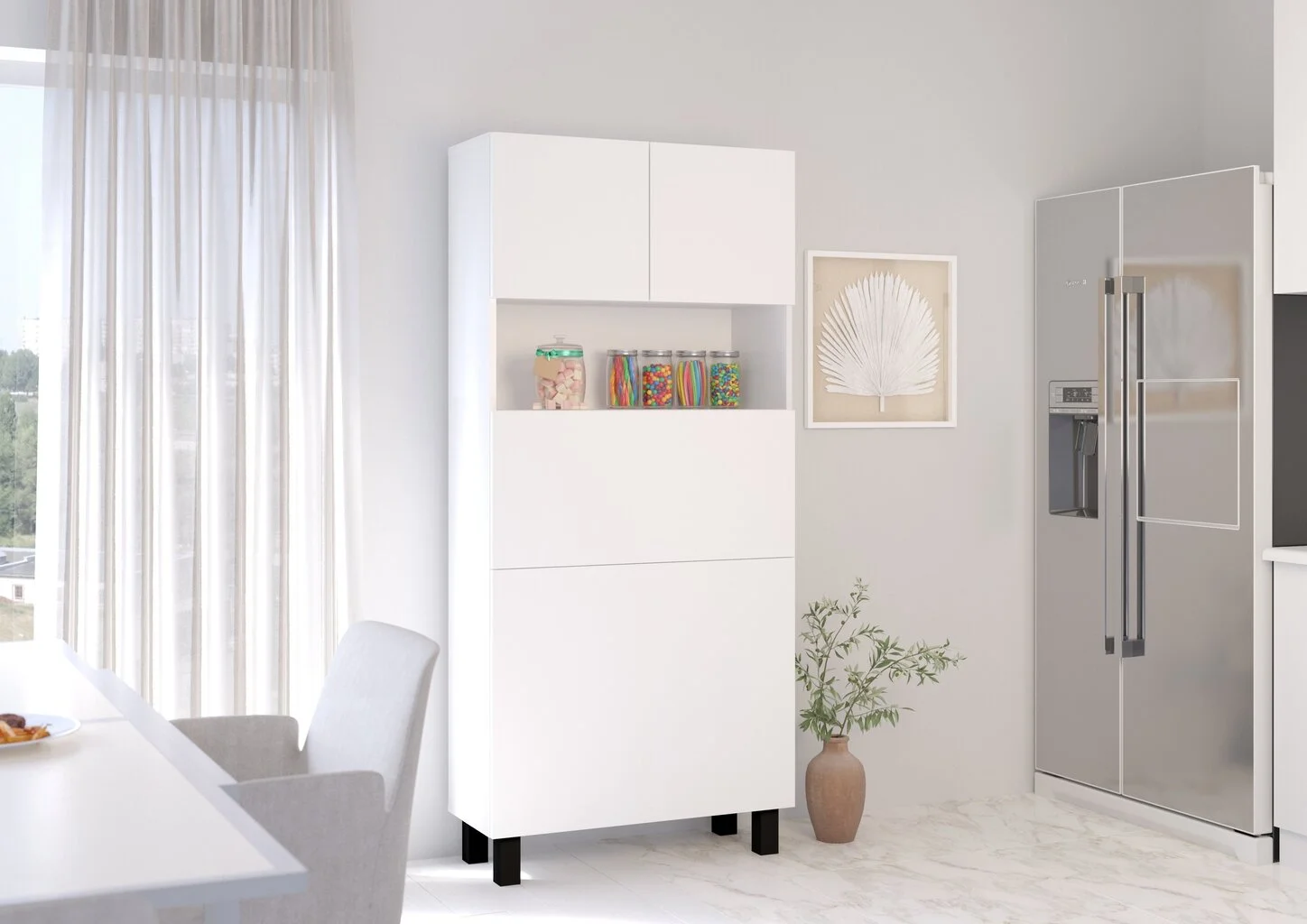 Erittäin käytännöllinen ja monipuolinen taitettava pöytä – Homi-kaappi sopii täydellisesti studioon, toimistoon tai nuorisohuoneeseen. Sen yksinkertaisuus ja minimalistinen muotoilu on sellaista toiminnallisuutta, joka vetoaa kaikkiin. Oven takana on myös hyllyjärjestelmä, joka auttaa järjestämään työtilasi.