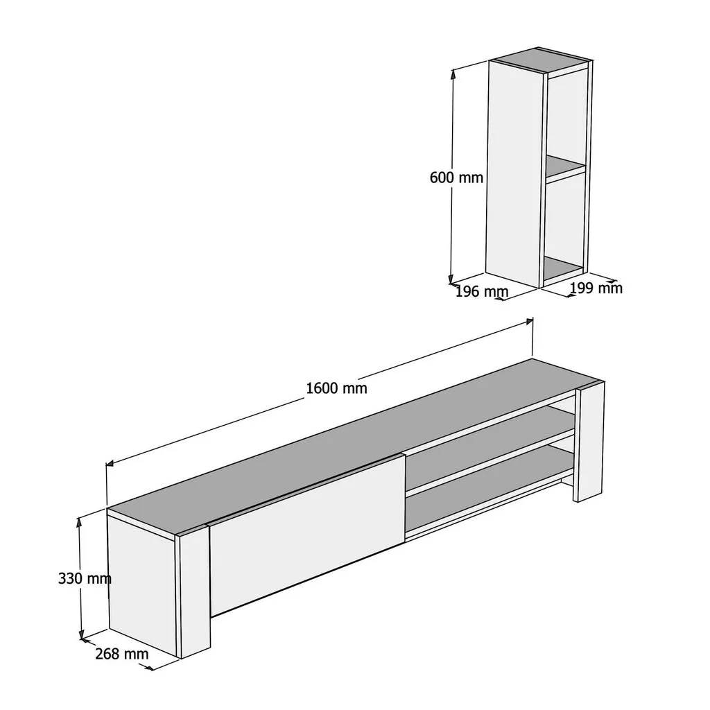- TV-pöydän mitat: pituus – 160 cm, korkeus – 33 cm,syvyys – 26,8 cm;