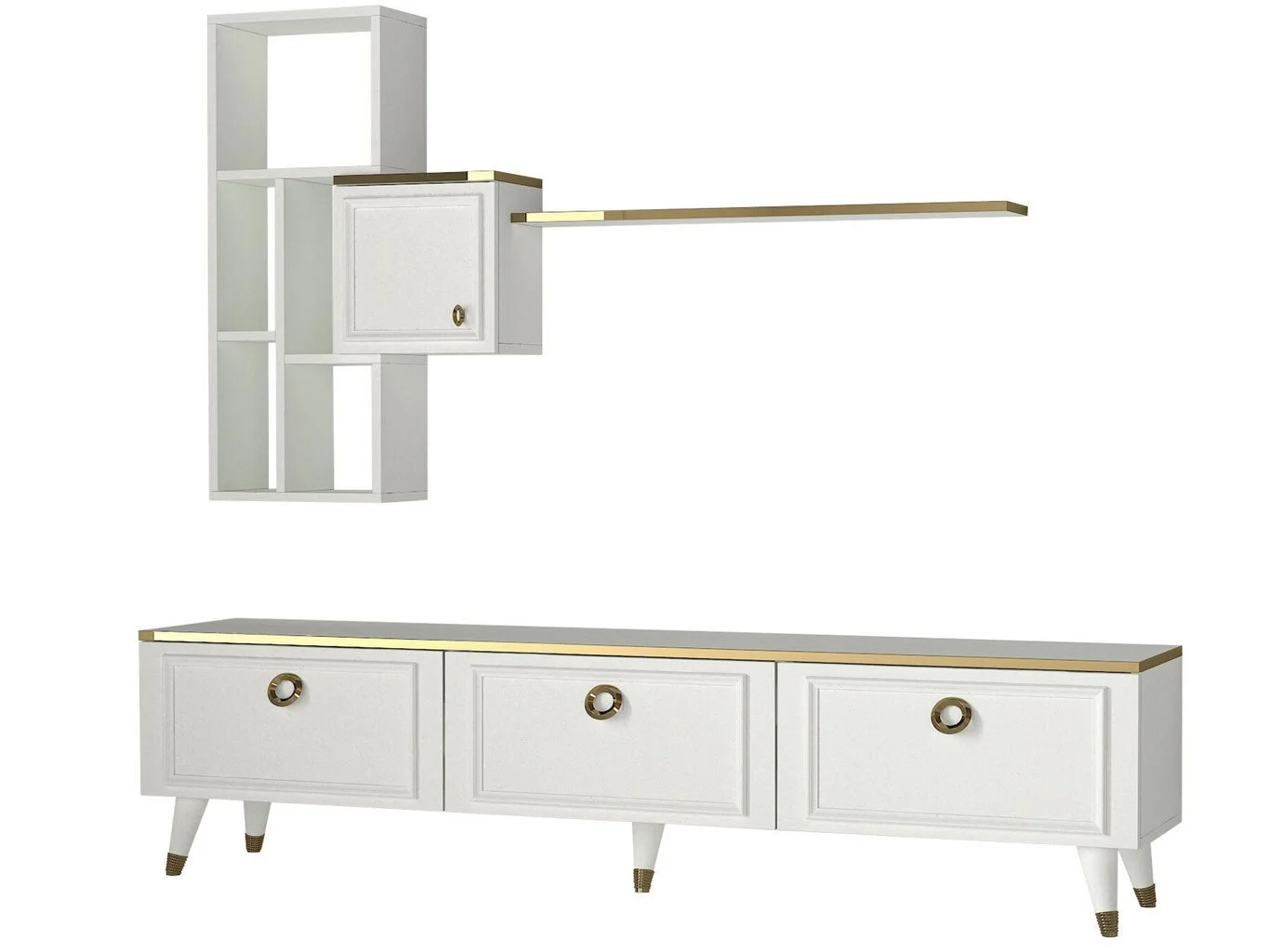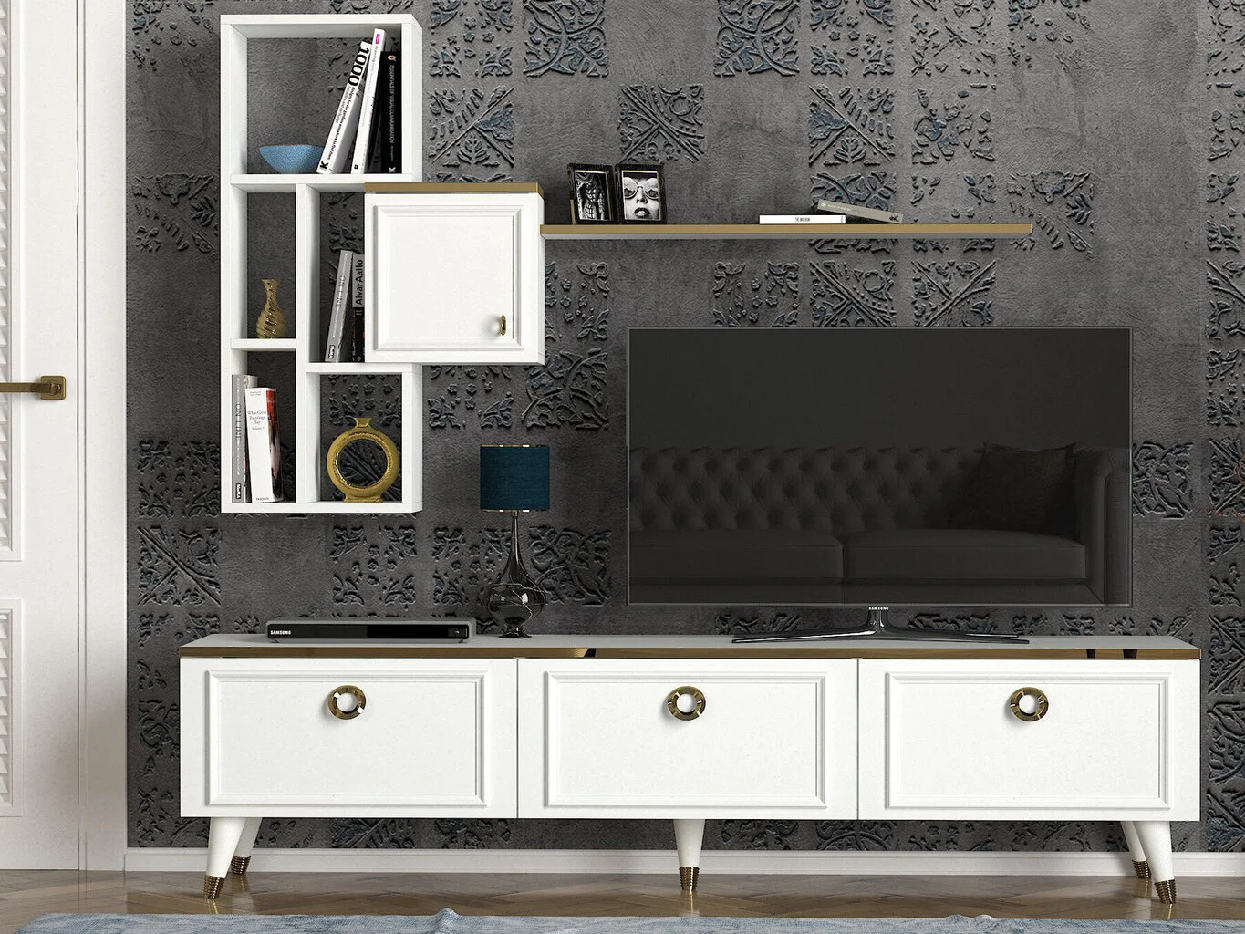 Kaikki nämä modernien huonekalujen ominaisuudet vahvistavat sen tosiasian, että tämän tyylin tuotteet ovat yksinkertaisia ja samalla erittäin yleisiä. Joten ne on helppo sijoittaa kaikenkokoisiin huoneisiin. Kaappikokonaisuus Kalune Design Kornelya, valkoinen/kulta pitää niistä, jotka haluavat luoda minimalistisen ja tilavan tilan, jossa on kunnollinen ja raikas luonto.