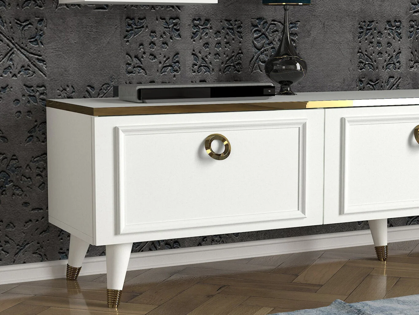 Levyn yläkerros peitetään usein erityisellä kalvolla, joka varmistaa huonekalun lujuuden. Viimeisimpien tuotantoteknologioiden avulla nämä laatat voivat olla kosteudenkestäviä, minkä vuoksi nämä materiaalit eroavat monipuolisuudestaan ja sopivat mihin tahansa huoneeseen. Kaappikokonaisuus Kalune Design Kornelya, valkoinen/kulta löytää varmasti paikan kodistasi!
