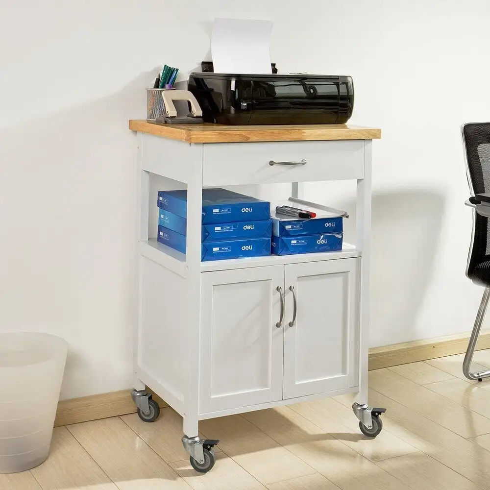 - Erittäin kätevä ja tilava pyörillä varustettu keittiökaappi, jossa on laatikko, avohylly ja kaksi ovea;
