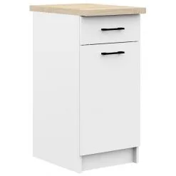 Levyn yläkerros peitetään usein erityisellä kalvolla, joka varmistaa huonekalun lujuuden. Viimeisimpien tuotantoteknologioiden avulla nämä laatat voivat olla kosteudenkestäviä, minkä vuoksi nämä materiaalit eroavat monipuolisuudestaan ja sopivat mihin tahansa huoneeseen. Keittiön kaappi NORE Oliwia S40, valkoinen löytää varmasti paikan kodistasi!
