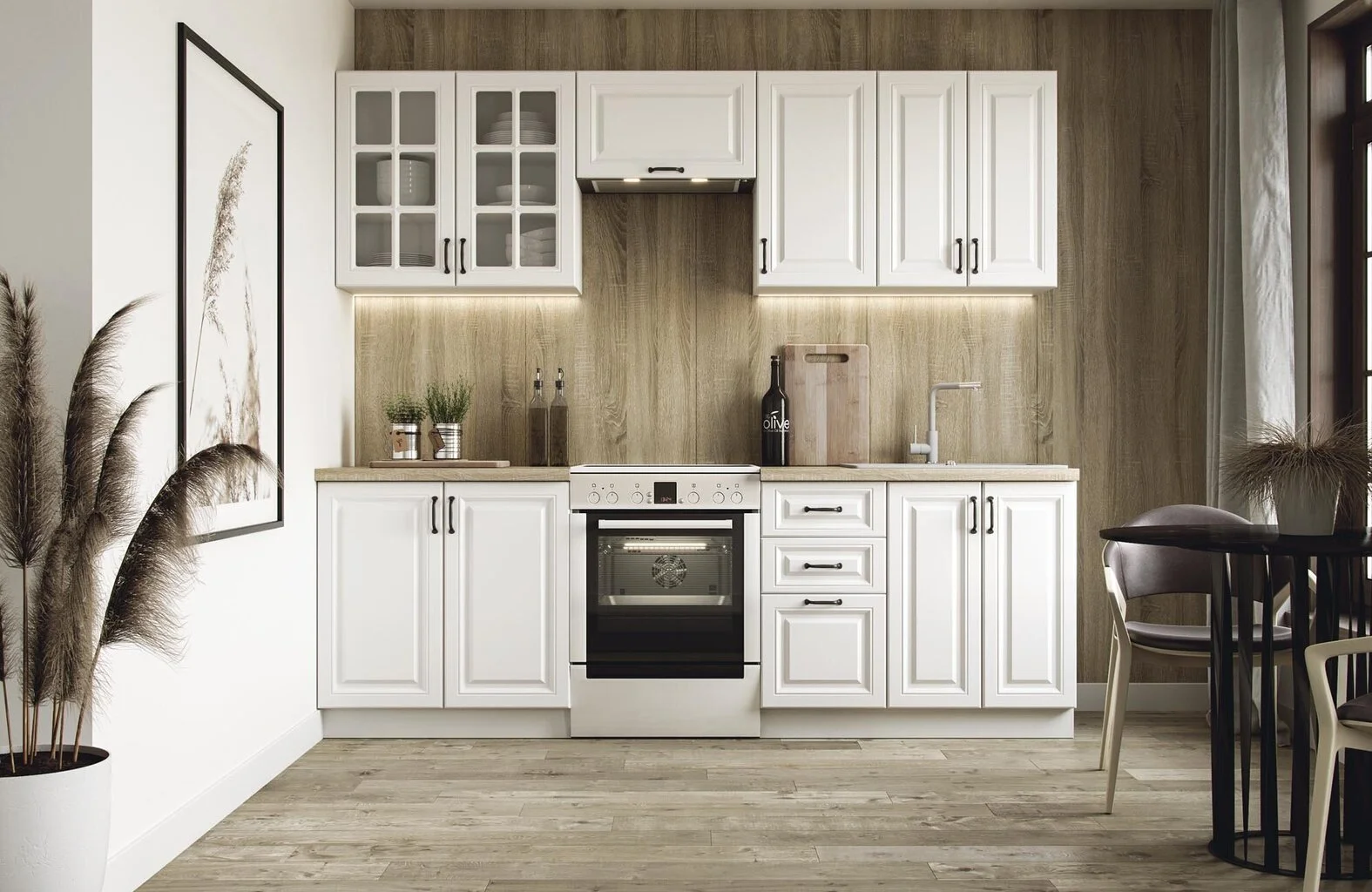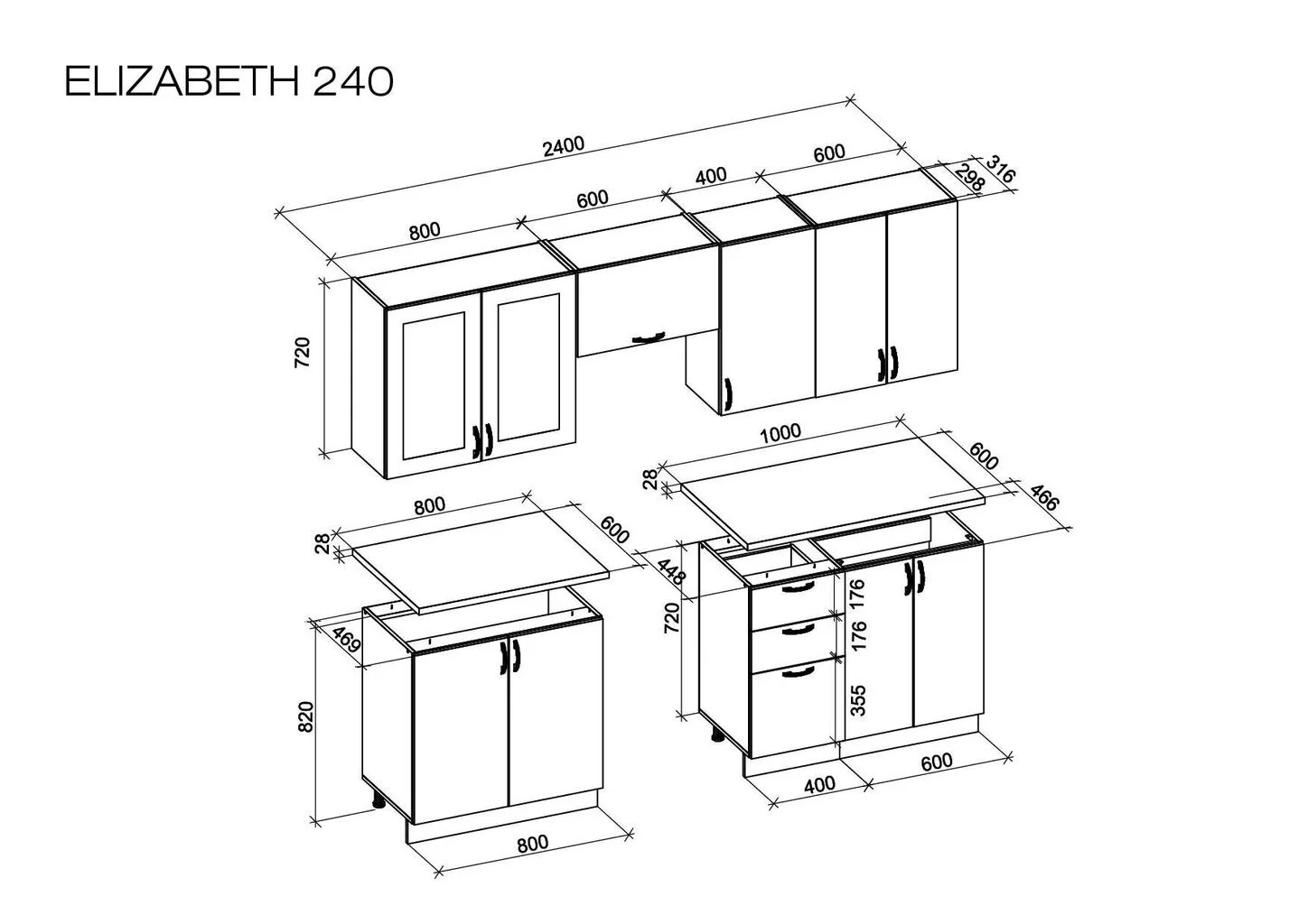 - Sarjan kokonaismitat: korkeus – 200 cm (voi vaihdella asennuksen mukaan), leveys – 240 cm (voi vaihdella asennuksen mukaan), syvyys työpinnan kanssa – 60 cm.