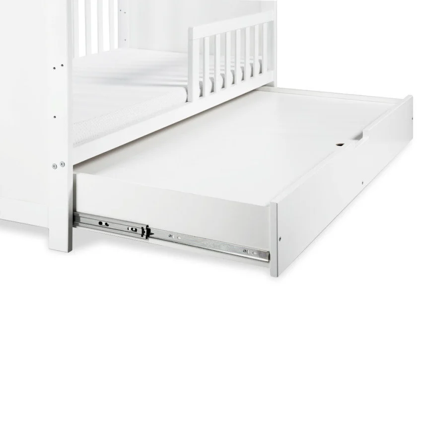 Kaunis ja käytännöllinen luomumaalilla päällystetty pinnasänky, jossa koristelu sivussa, jossa tilava laatikko vuodevaatteille, vaatteille tai leluille – se on loistava ratkaisu vauvan huoneeseen! Pinnasängyssä on säädettävä korkeustoiminto ja ulos vedettävät sivutangot, jotka ovat erittäin hyödyllisiä vauvan kasvaessa ja tottuessa tavalliseen sänkyyn.