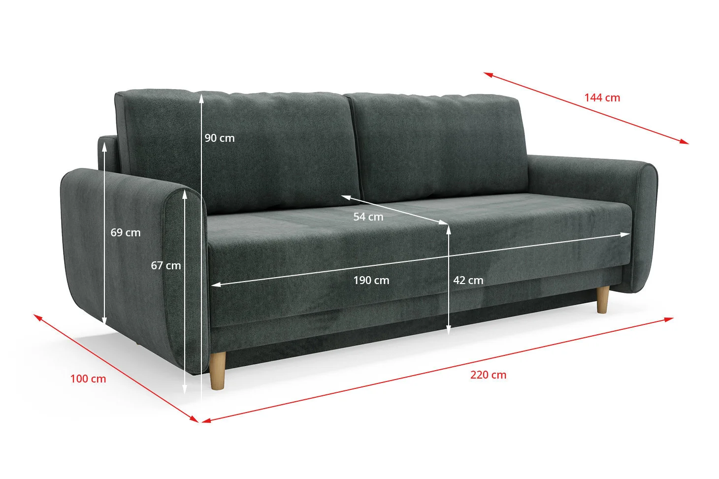 - Kalusteen ulkomitat: pituus – 220 cm, syvyys – 100 cm, korkeus – 90 cm.