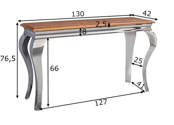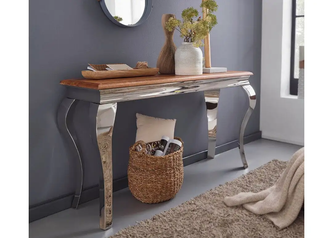 Huomiota herättävä konsolipöytä. Pöydässä on hopeanväriset metallijalat. Pöytälevy on valmistettu aidosta (FSC-sertifioidusta) Intian ruusupuusta, päällystetty lakalla. Tuote on valmistettu käsityönä. Jokainen pöytä on ainutlaatuinen ja voi erota kuvan tuotteesta, koska tuote on aitoa puuta.