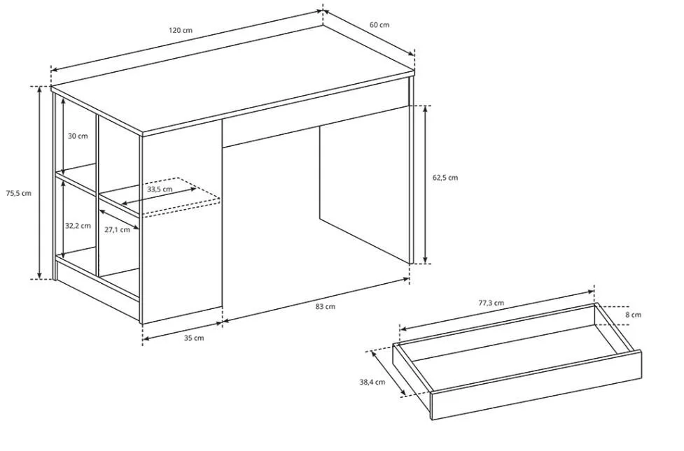 - Mitat: pituus 75,5 cm, syvyys 120 cm, korkeus 60 cm;