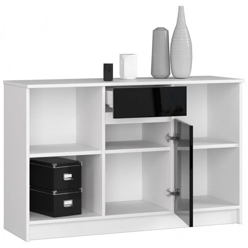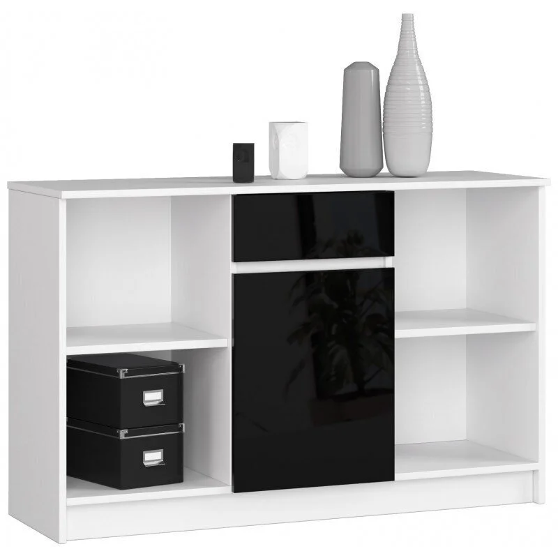 Tämä on ainutlaatuisesti muotoiltu tilava lipasto, jossa on kaksi avohyllyä ja kaappi. Kaappi on valkoinen, ja siinä on musta laatikko ja musta kaapin ovi.