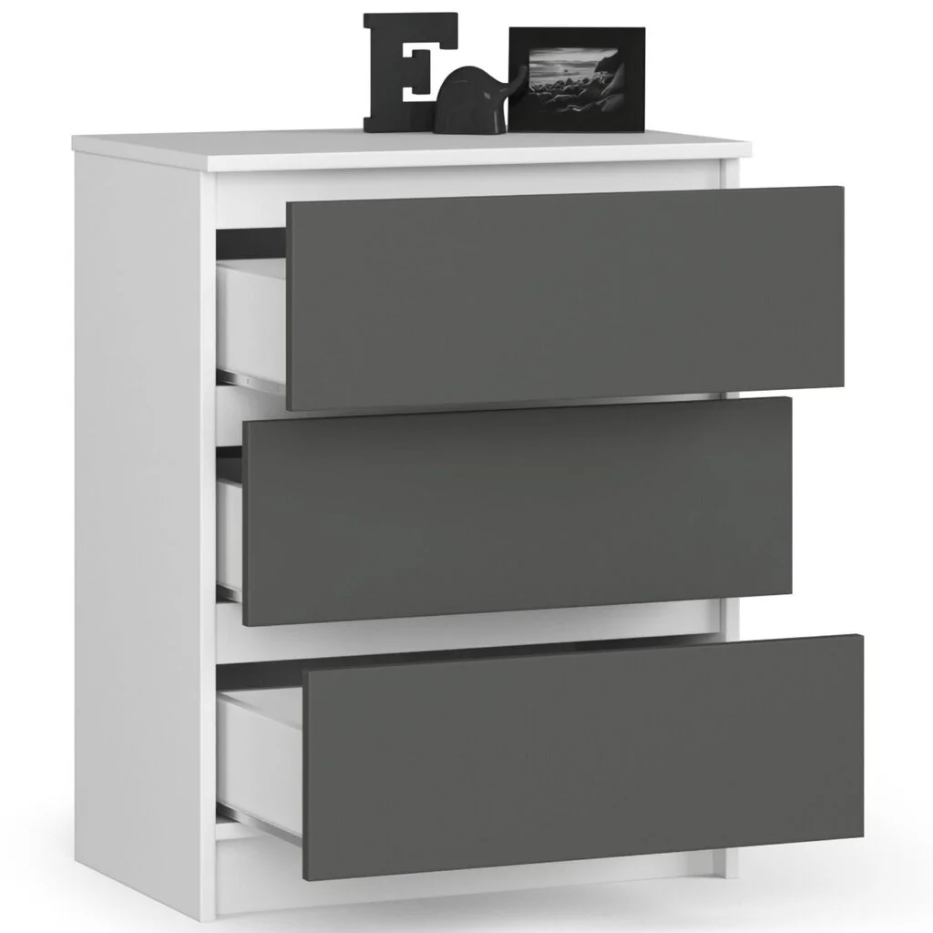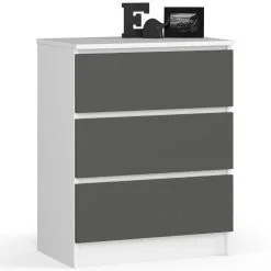 Levyn yläkerros peitetään usein erityisellä kalvolla, joka varmistaa huonekalun lujuuden. Viimeisimpien tuotantoteknologioiden avulla nämä laatat voivat olla kosteudenkestäviä, minkä vuoksi nämä materiaalit eroavat monipuolisuudestaan ja sopivat mihin tahansa huoneeseen. Lipasto NORE K60 3, valkoinen / tummanharmaa. löytää varmasti paikan kodistasi!