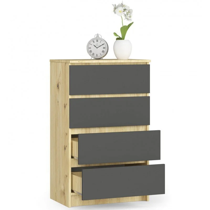 Levyn yläkerros peitetään usein erityisellä kalvolla, joka varmistaa huonekalun lujuuden. Viimeisimpien tuotantoteknologioiden avulla nämä laatat voivat olla kosteudenkestäviä, minkä vuoksi nämä materiaalit eroavat monipuolisuudestaan ja sopivat mihin tahansa huoneeseen. Lipasto NORE K60 4 laatikolla, ruskea/tammi löytää varmasti paikan kodistasi!