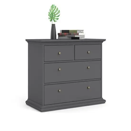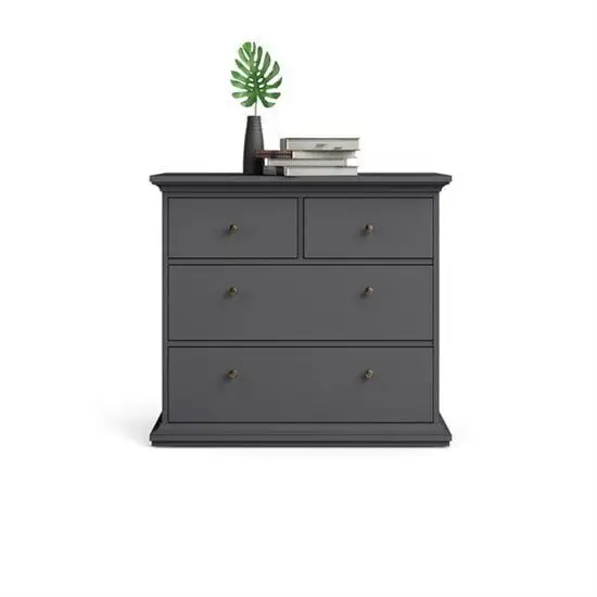 Minimalistinen lipasto, jossa 4 laatikkoa, joihin mahtuu vaatteet, liinavaatteet ja monet muut tavarat. Yhdistä lipasto muihin Paris-malliston huonekaluihin luodaksesi toimivan ja modernin kodin sisustuksen.
