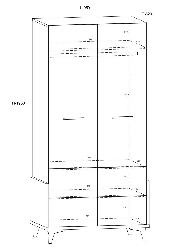 - Kaapin sisäpuoli: Yksi vaatetanko vaatteiden ripustamista varten sekä yksi hyllytaso.