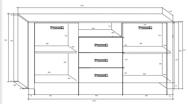 - Mitat: syvyys 44 cm, leveys 176 cm, korkeus 82 cm.