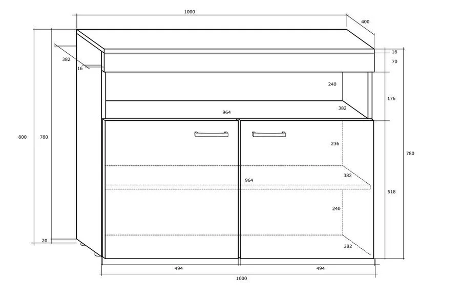 Mitat: syvyys 42 cm, leveys 100 cm, korkeus 80 cm.