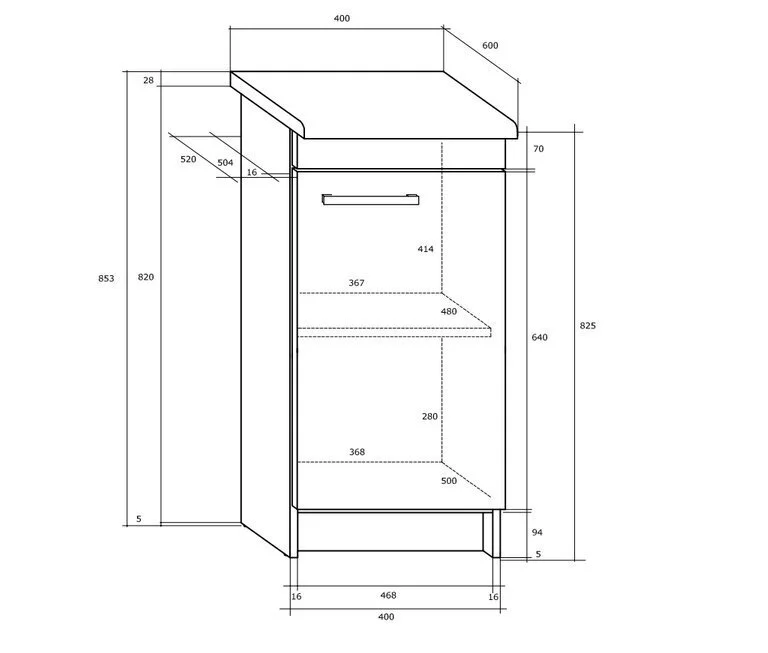 - Mitat: syvyys 60 cm, leveys 40 cm, korkeus 85 cm.