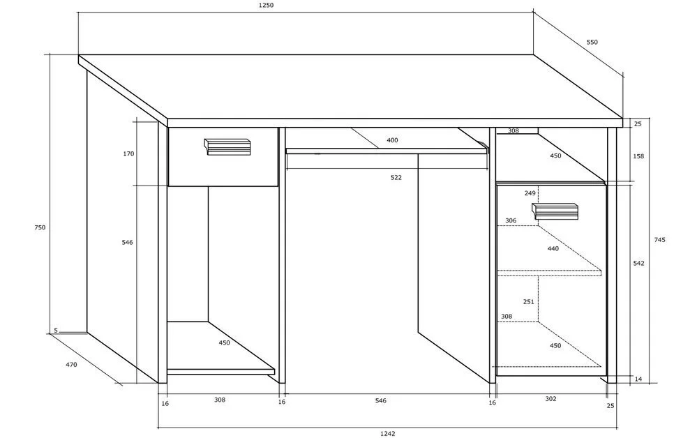 Tietokonepöytä, jossa 1 laatikko ja 1 ovi.