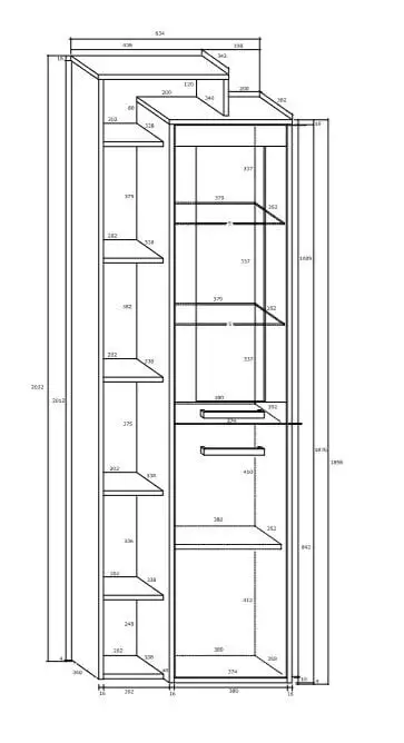 Mitat: syvyys 41 cm, leveys 64 cm, korkeus 203 cm.