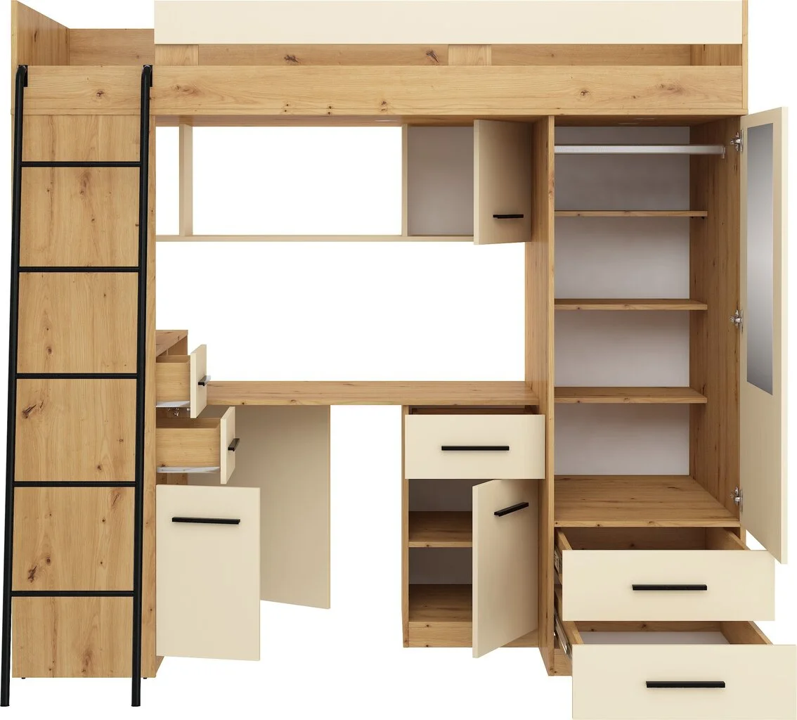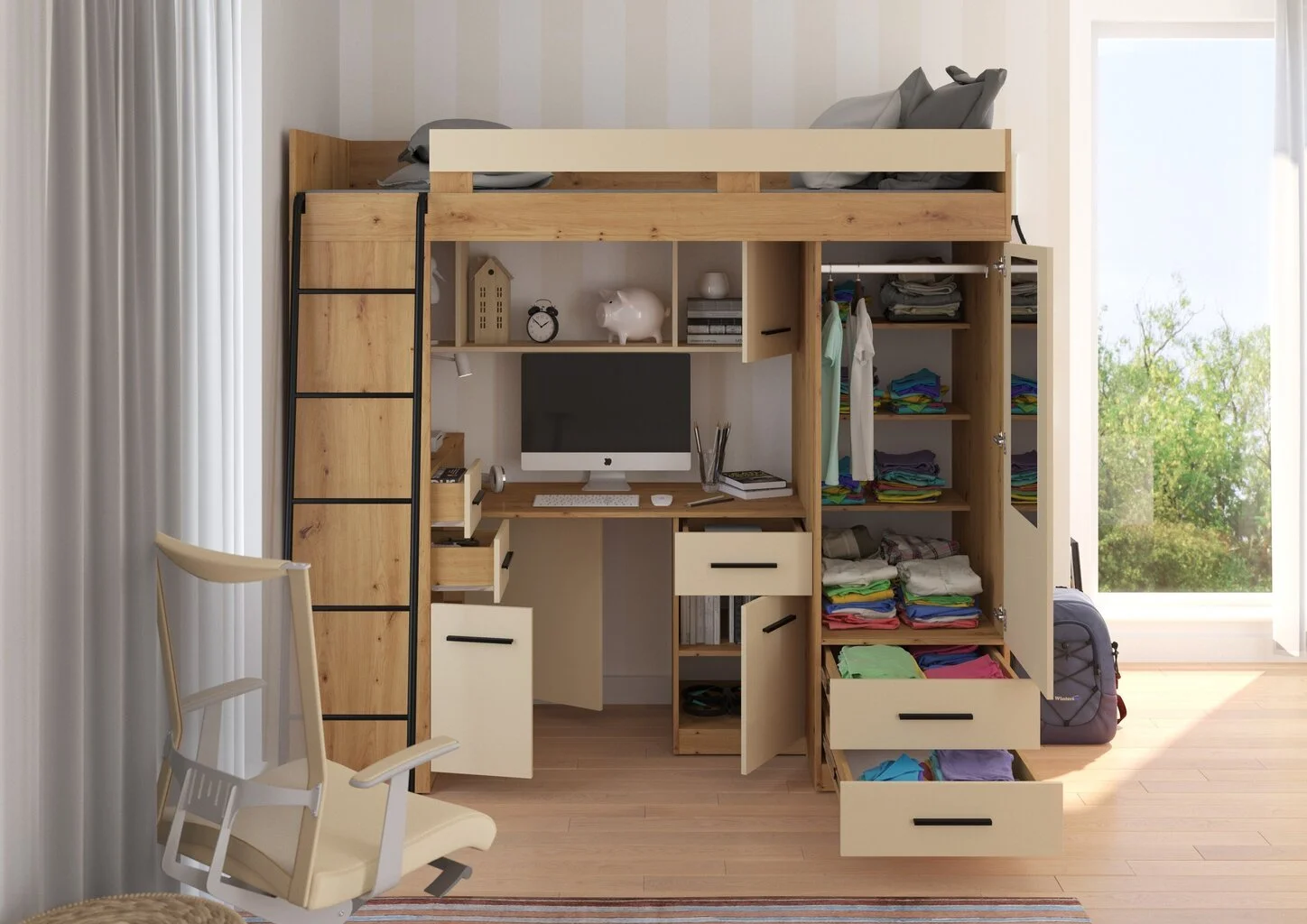Tämä käytännöllinen lastenhuoneen kalustesetti ainutlaatuisella muotoilulla säästää tilaa lastenhuoneessa ja auttaa pitämään asiat järjestyksessä.