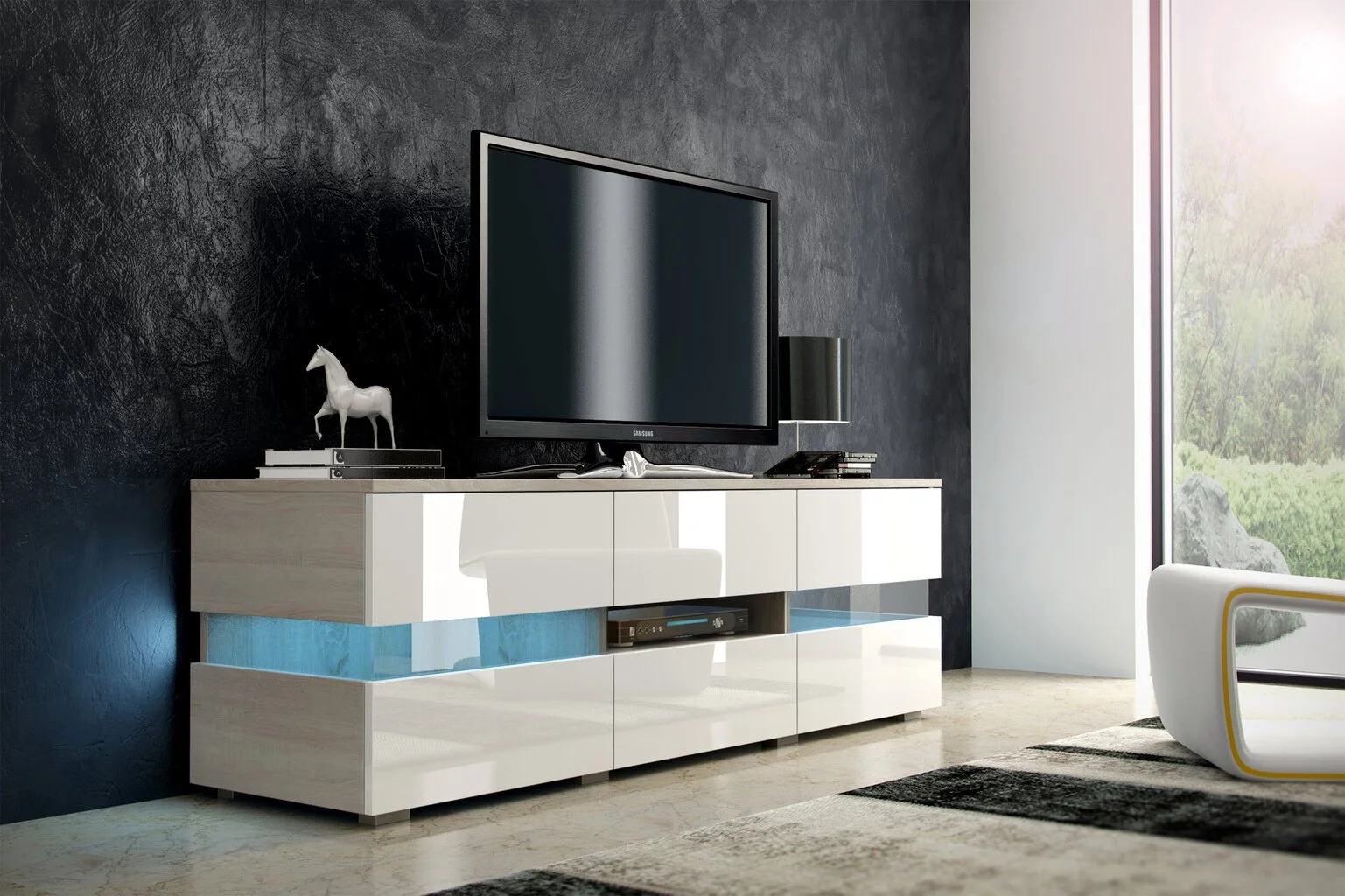 Modernilla designilla varustettu TV-pöytä Inter lisää modernia olohuoneeseesi. Minimalistisen muotoilun ja tilavuuden ansiosta tälle pöydälle on mahdollista säilyttää oikein kaukosäätimet, DVD-laitteet tai muut olohuoneen tarvikkeet.