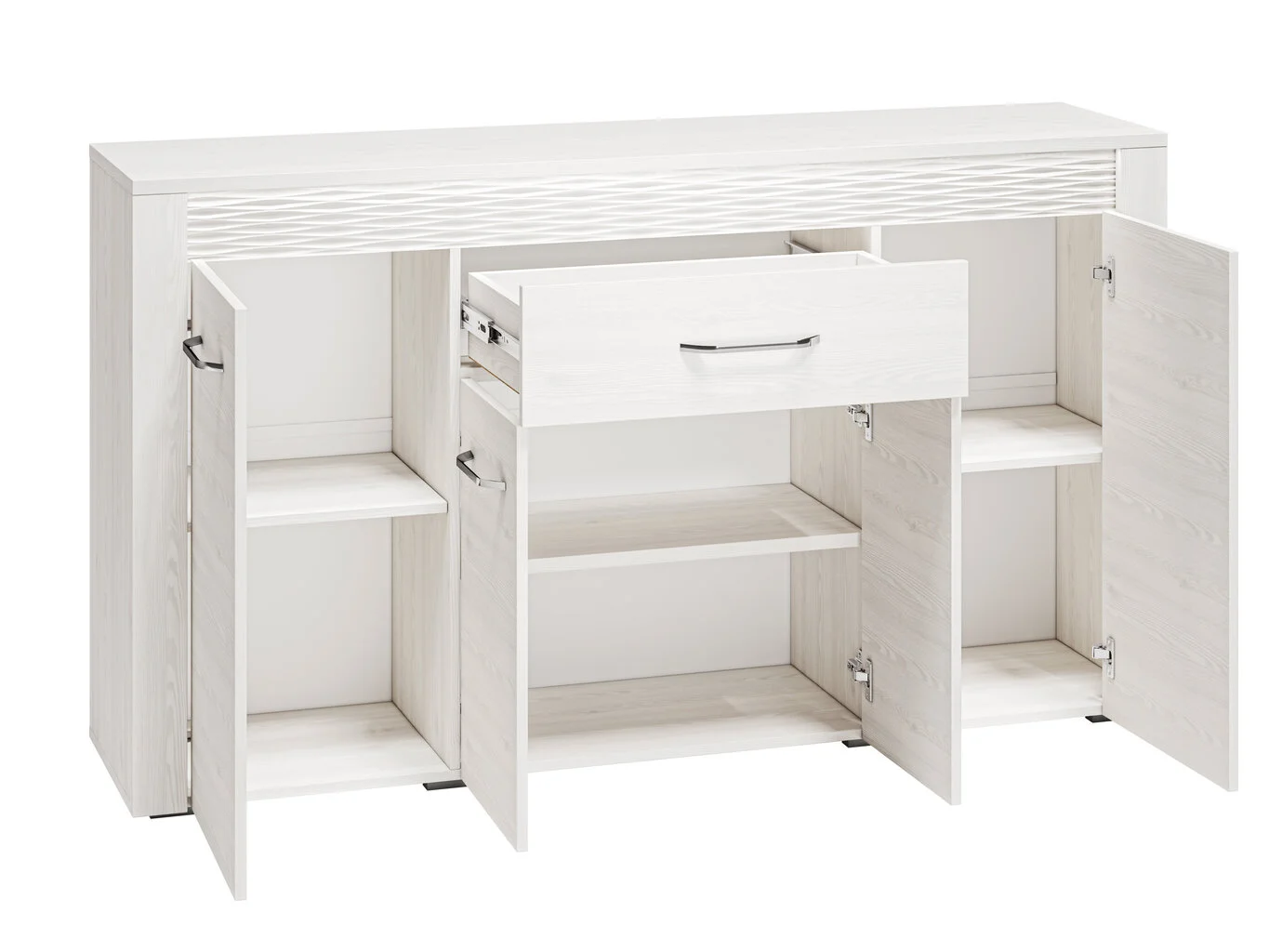 - Tyylikkäästi suunniteltu, toimiva lipasto, jossa on neljä ovea ja laatikko;