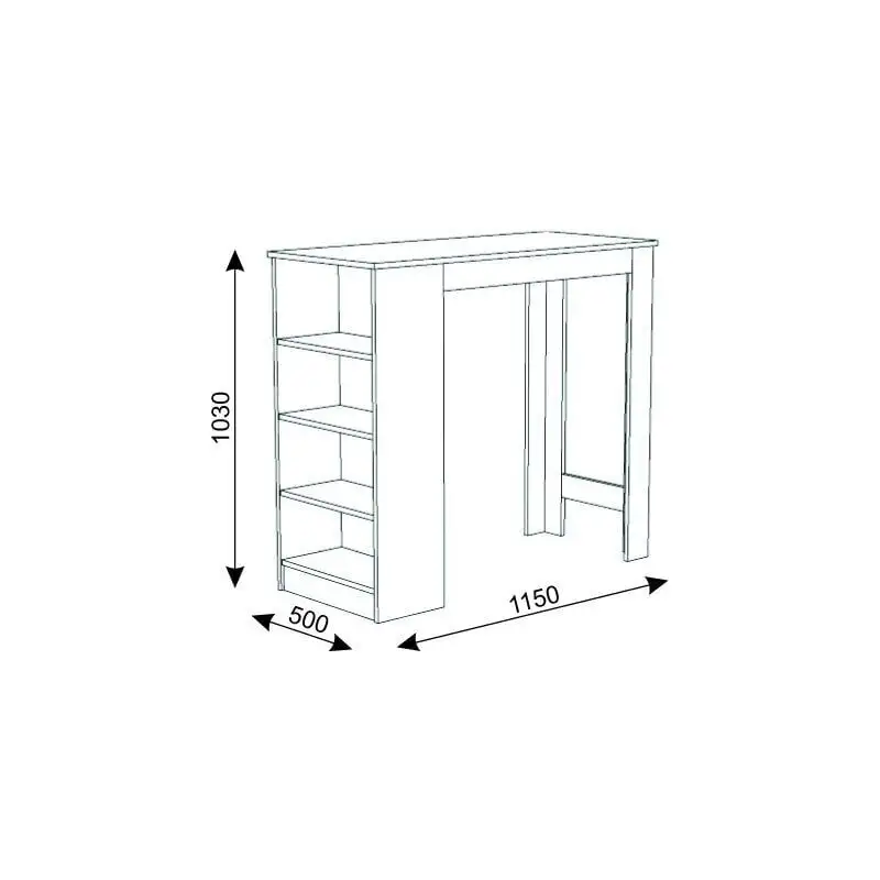 Tyylikäs, pitkä ja käytännöllinen pöytä neljällä sivuhyllyllä astioiden tai muiden tarvikkeiden säilyttämiseen. Moderni ja kompakti baaripöytä sulautuu täydellisesti nykyaikaiseen keittiöön tai ruokailutilaan tai muuhun pieneen tilaan.