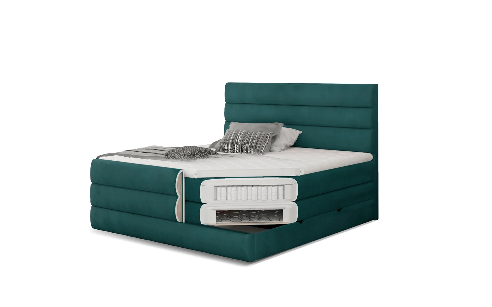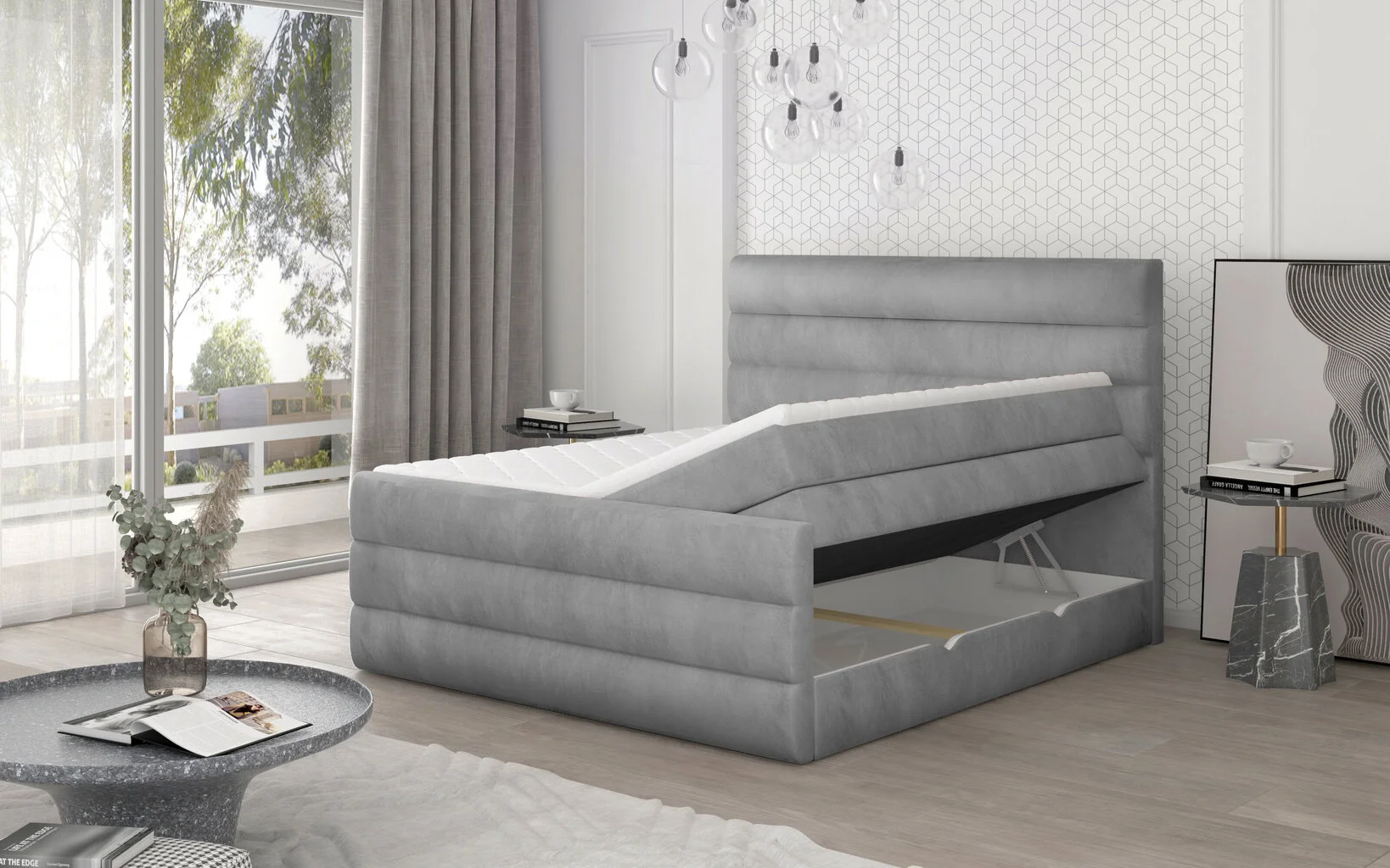 Parisänky korkealla sängynpäädyllä ja tilavalla vuodevaadelaatikolla, johon voit mukavasti säilyttää vuodevaatteet tai muut tavarat säästäen tilaa kotona. Mukava ja käytännöllinen sänky sopii täydellisesti muiden huonekalujen kanssa ja tuo mukavuutta kodin sisustukseen.