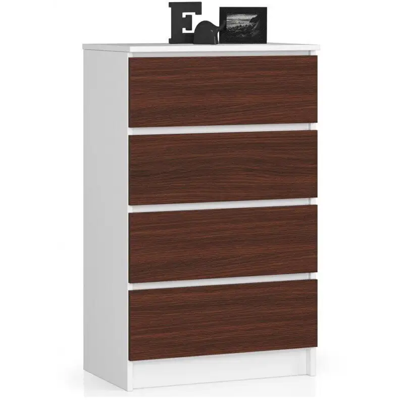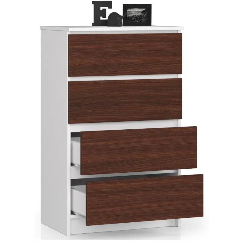 Levyn yläkerros peitetään usein erityisellä kalvolla, joka varmistaa huonekalun lujuuden. Viimeisimpien tuotantoteknologioiden avulla nämä laatat voivat olla kosteudenkestäviä, minkä vuoksi nämä materiaalit eroavat monipuolisuudestaan ja sopivat mihin tahansa huoneeseen. Lipasto NORE K60 4 laatikolla, ruskea/valkoinen löytää varmasti paikan kodistasi!