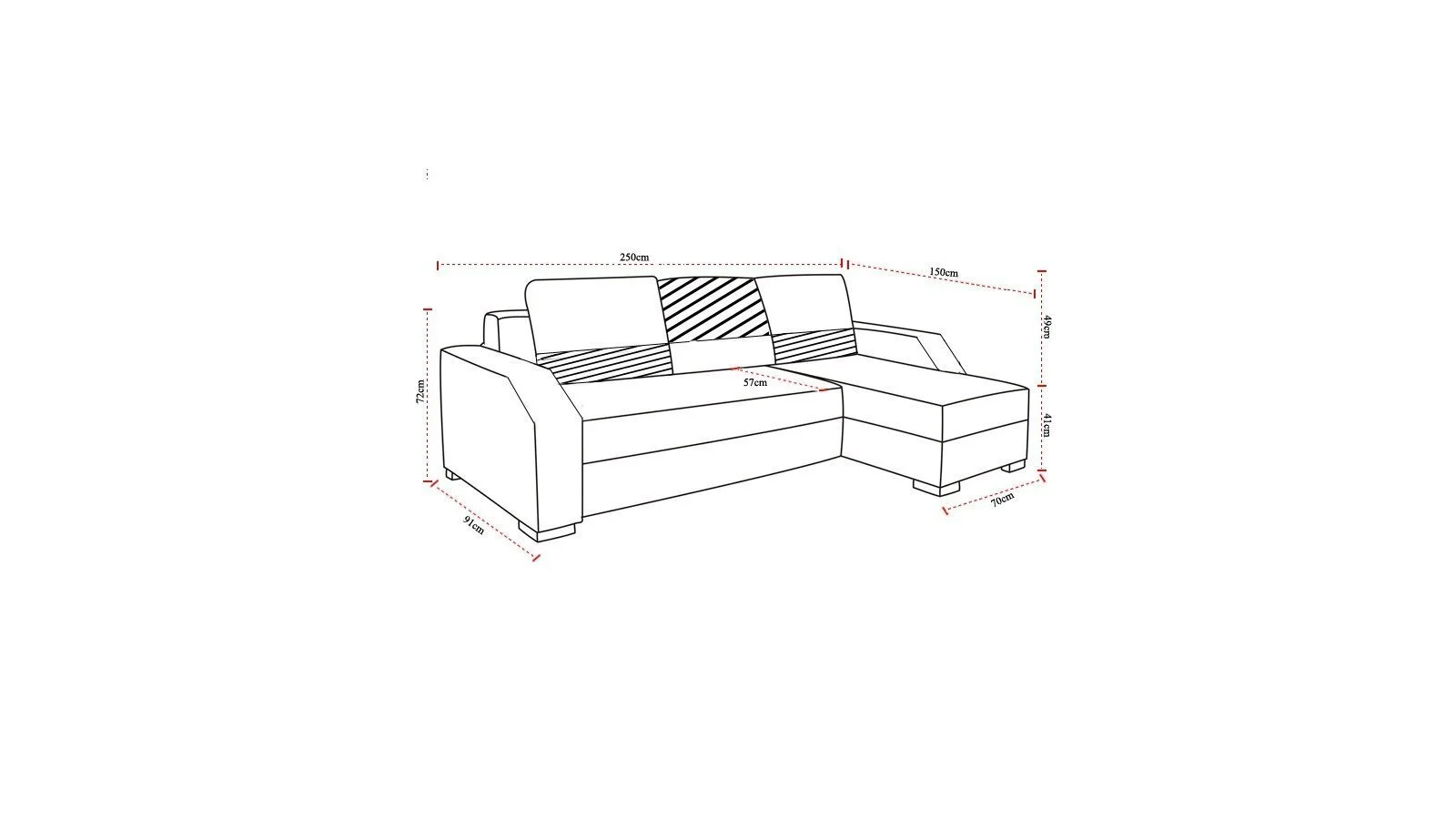 Mitat: leveys – 250 cm, syvyys – 150 cm, korkeus – 90 cm;