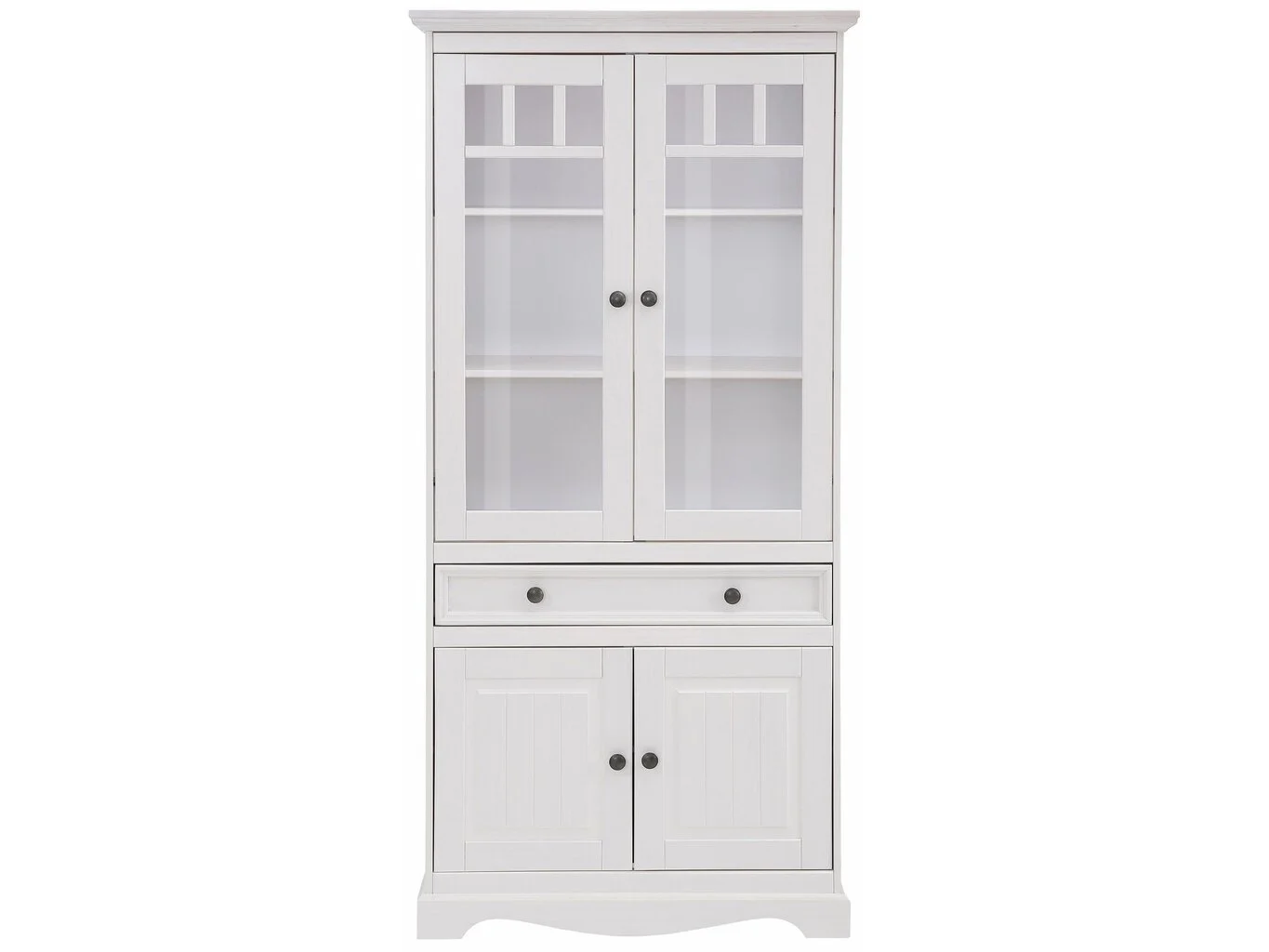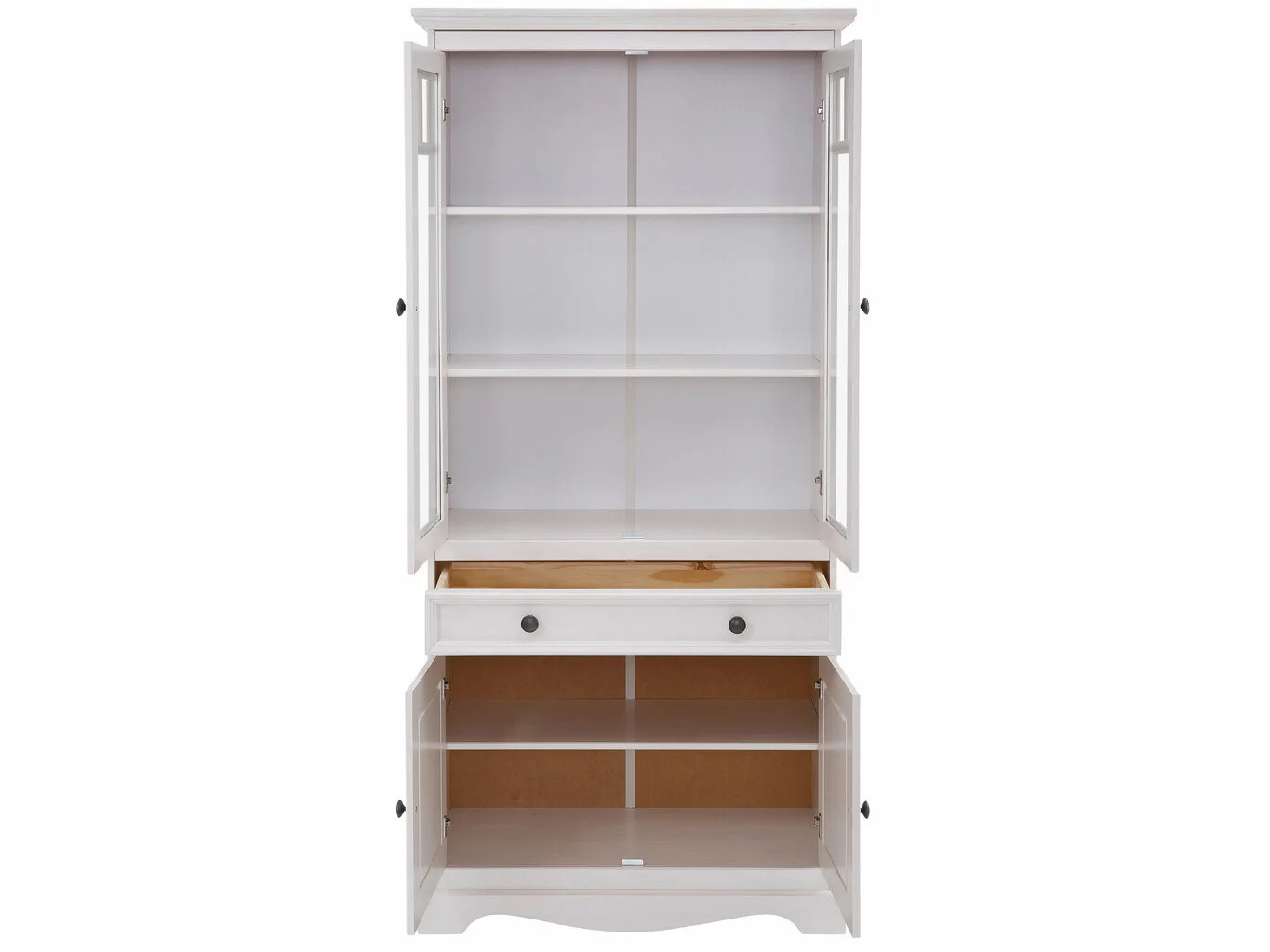 Vitriinissä on viisi lokeroa ja sisällä laatikko, johon voit säilyttää astioita, työkaluja tai koristeita tilavasti ja järjestelmällisesti. Kaunis vitriini on koristeltu metallikahvoilla ja lasilla – täydellinen korostus tyylikkääseen huoneeseesi! Vitriini on valmistettu vahvasta ja kestävästä mäntypuusta.